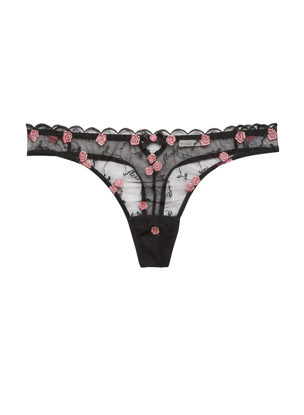 Inspired by Charles Baudelaire’s masterful collection of poetry entitled “Les Fleurs du Mal,” Jennifer Zuccarini founded Fleur du Mal with the belief that wearing beautiful lingerie should be an everyday affair. Tastefully provocative, the luxury brand has amassed a cult following of devotees who adore the sultry and empowering pieces. The Rose & Vine Embroidery Thong in Black features custom rose embroidery with Fleur logo script and a delicate rosette bow detail. A flirty scalloped legline and sheer mesh back complete this romantic design. Pair with the matching Rose & Vine Embroidery Balconette Bra and Garter Belt for an immaculate set.