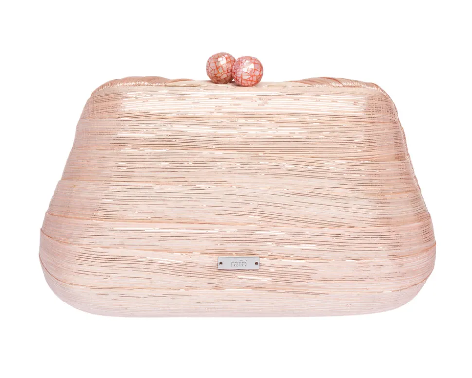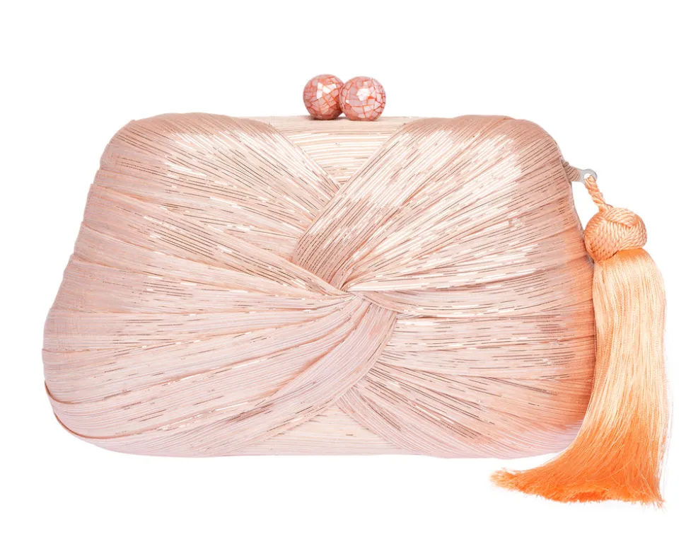 Rafe Totengco finds inspiration in architectural forms the world over for his exquisite minaudières and clutches. Born in the Philippines and based in New York city, Totengco weaves multi-cultural references into his carefully detailed accessories, which impart not only a sense of everyday glamour, but that of objects d’art. Boasting peach abaca and silver lurex, the Rosie Clutch in Peach adorns a draped front and silk tassel.