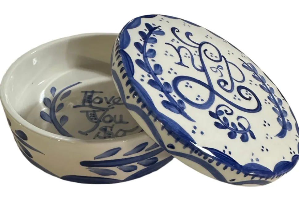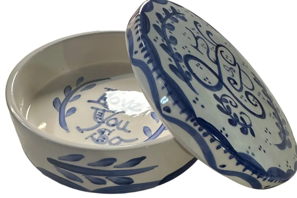 Self-taught artist Tricia Lowenfield crafts one-of-a-kind whimsical pieces that will become family treasures in time. The Round Keepsake Box in Blue & White is a hand-painted ceramic trinket box designed to hold life’s small treasures. Whether given as a gift or kept as a personal memento, each piece is lovingly detailed by Tricia, making it a meaningful addition to any space.