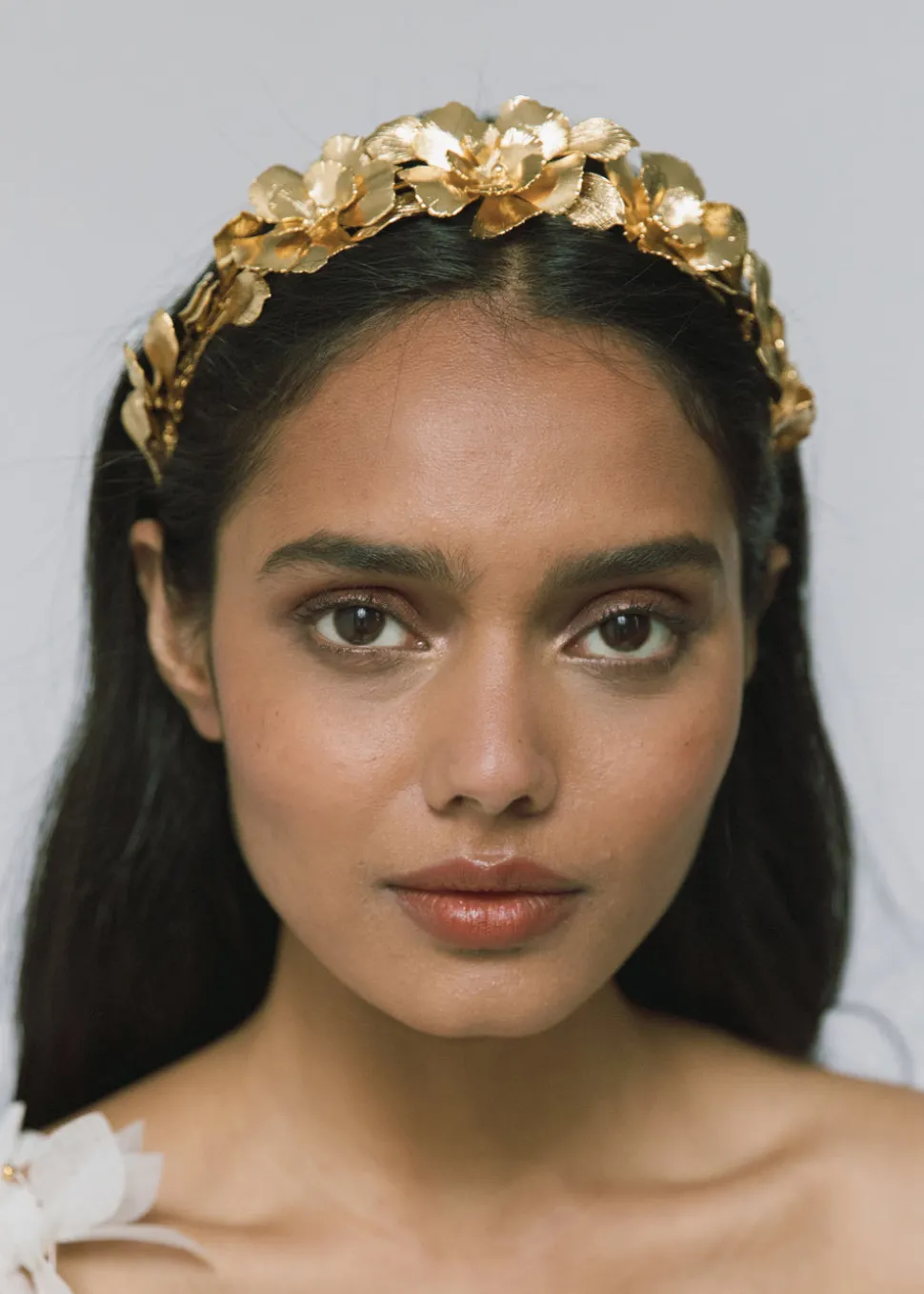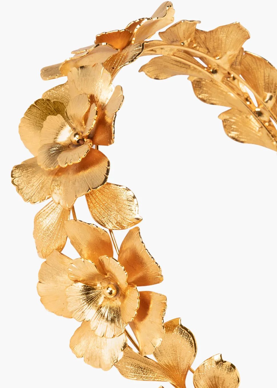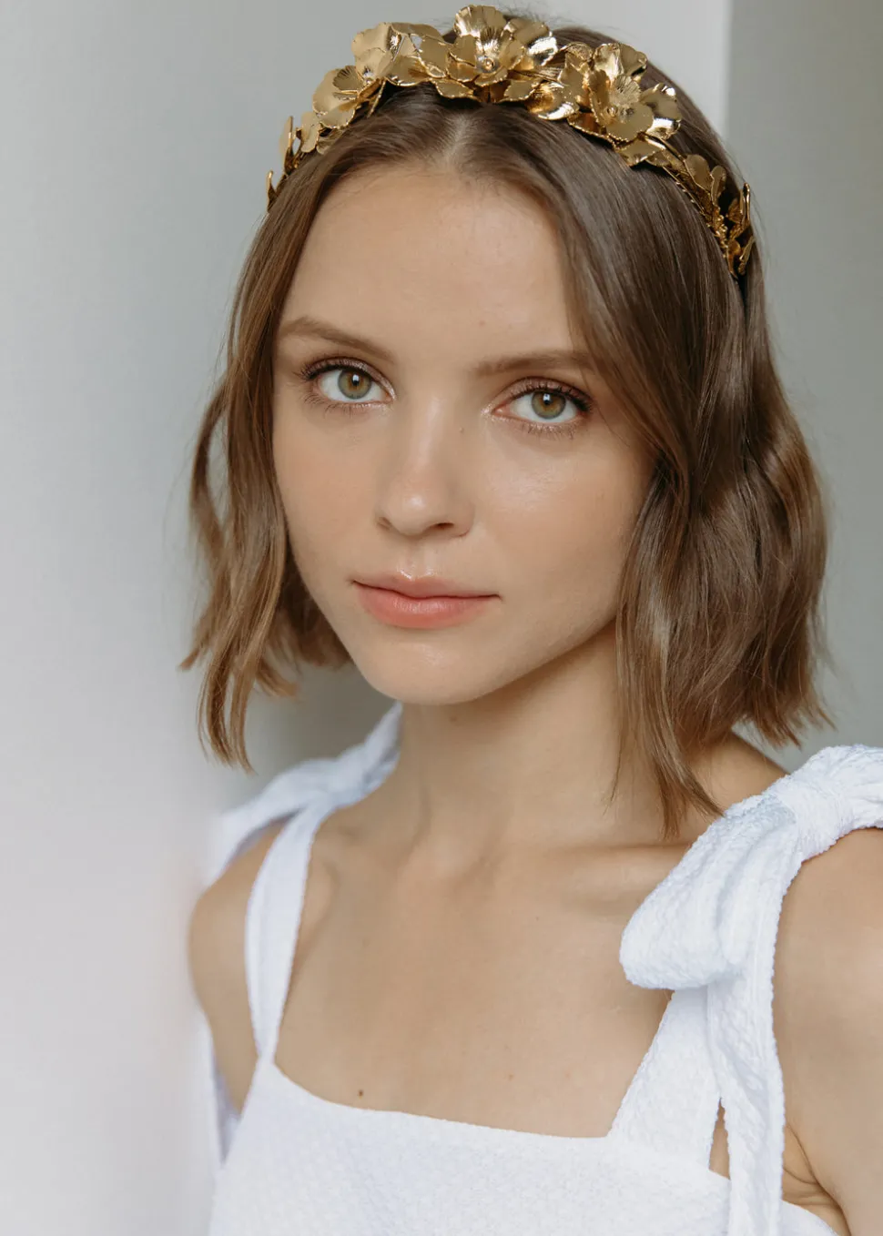 Each Rowena Headband is constructed by hand in Jennifer Behr’s Brooklyn studio, so every one is one-of-a-kind, and no two are entirely alike. Featuring a combination of golden blooms and life-like foliage, the Rowena evokes an ethereal, Grecian mood, and can be worn atop the head like a headband, or in the back of the head, framing an up-do or loose waves. This headpiece is finished with a string-tie back, ensure a customized and secure fit.