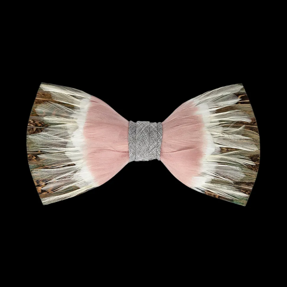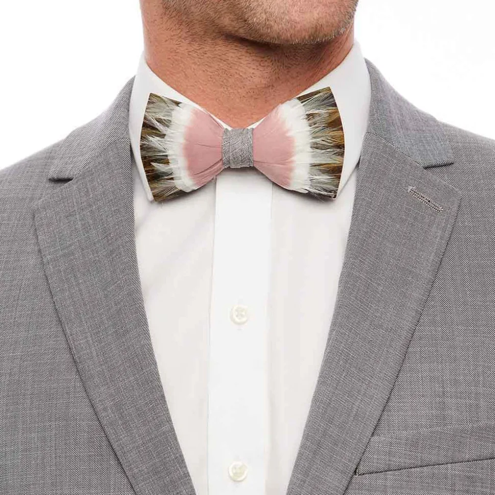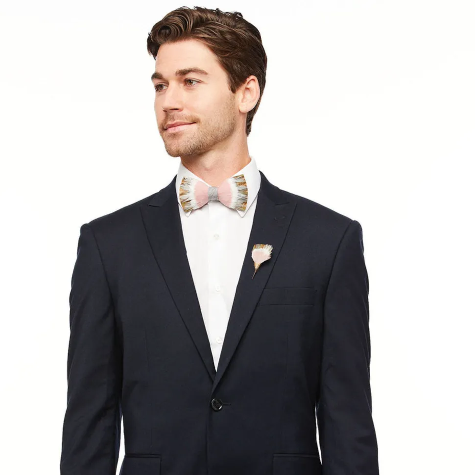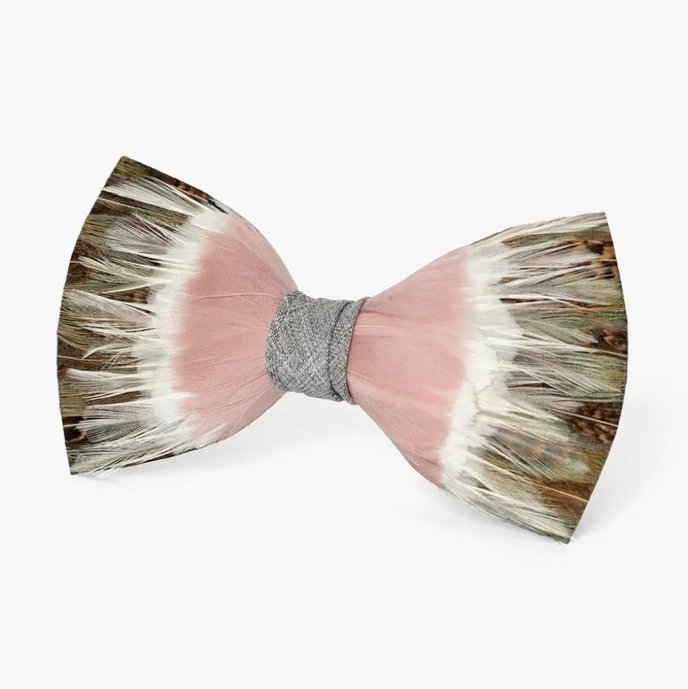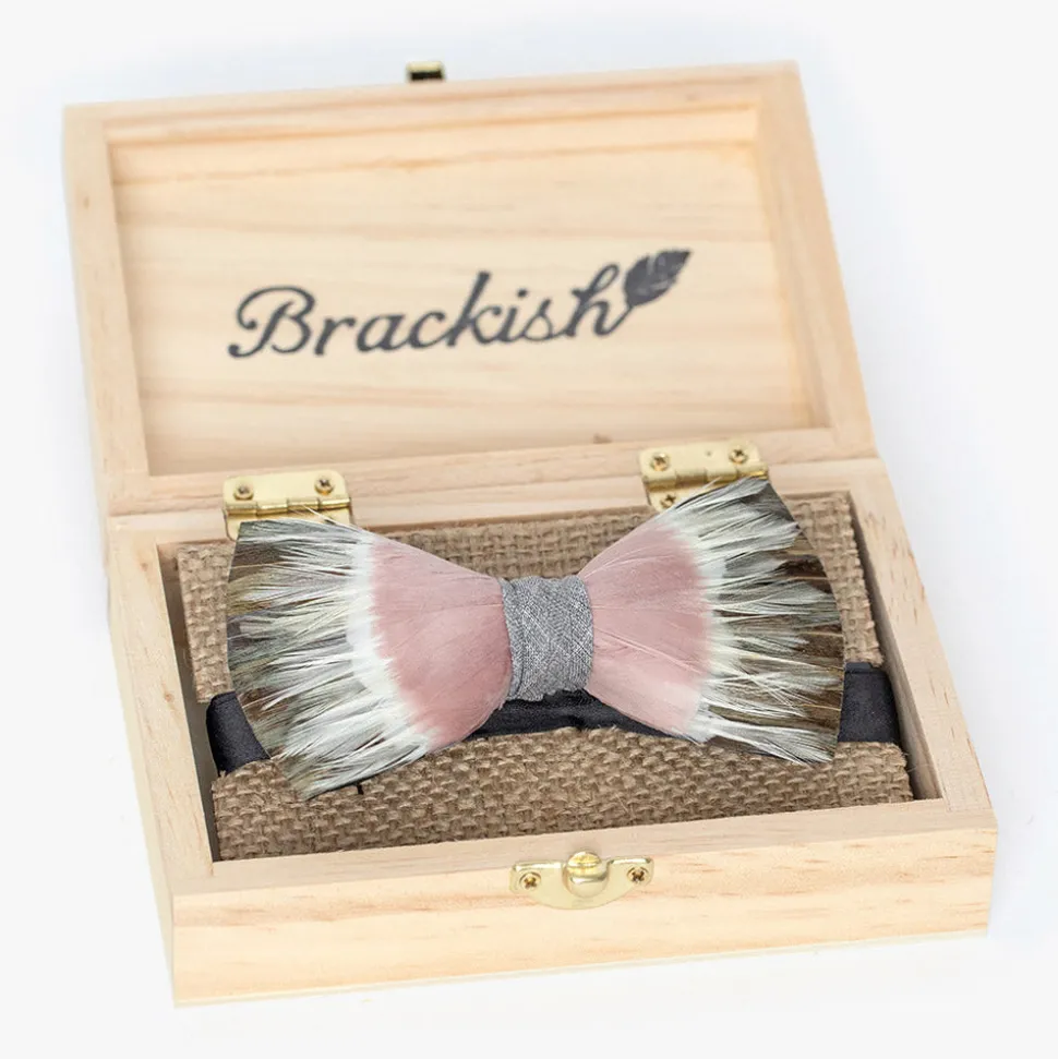 Brackish began with one feather bow tie designed by Ben Ross and gifted to his groomsman, Jeff Plotner. Since its inception, the brand has blossomed into a full line of men’s and women’s accessories designed and handcrafted in Charleston, South Carolina with each piece focused on honoring the beauty found in nature. A part of the inaugural wedding collection, the Royal Bow Tie is named after the horse, Royal II, who took 4th place in the 41st running of the Kentucky Derby in 1915. When drawing inspiration for this collection, co-founder Ben Ross was inspired by spring and summer events in which we gather and celebrate together—particularly horse races. Each style in this range is named after a racehorse whose name is not well known in the hopes that their legacy will live on. This piece is made with hunter green and brown pheasant, blush goose and off-white rooster feathers.