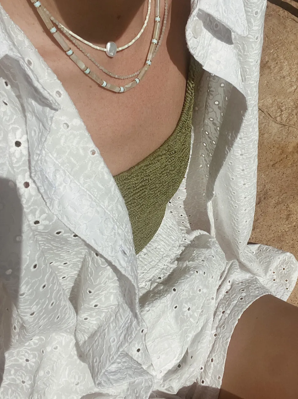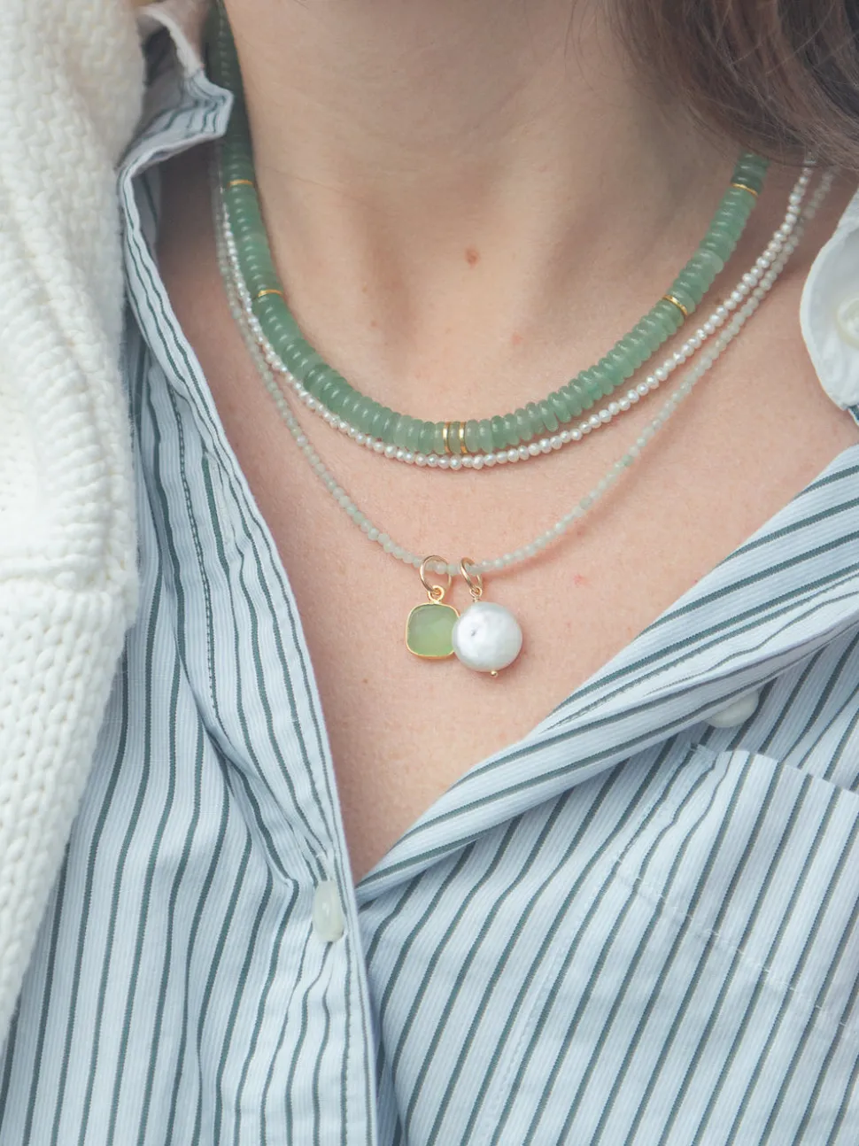 From Newport, Rhode Island, designer Kerry McGauley uses her experience in the fashion industry and inspiration from the town’s picturesque shoreline to craft singular yet timeless pieces—shining at the most memorable events and through your everyday. Faceted with pink opal gemstones and a freshwater pearl charm, the Rue Necklace in Mint features a gold-filled spring ring closure.