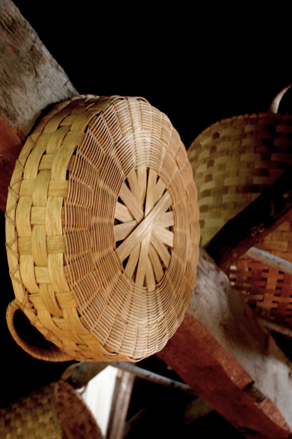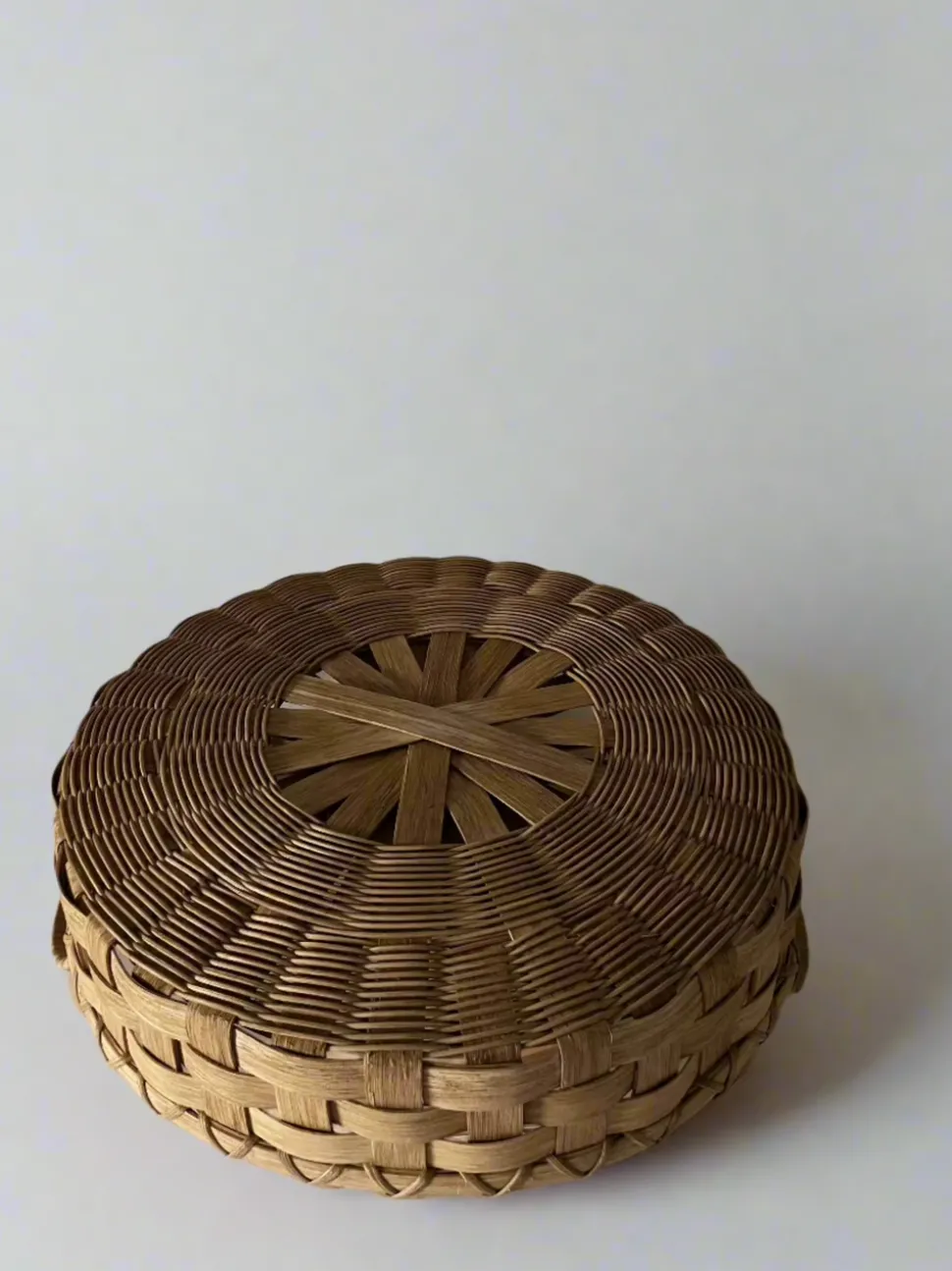 100% Rattan. Designed and hand-crafted by Erin and Peggy Pollard. Beautiful color variation from the natural rattan fibers. Made in United States.