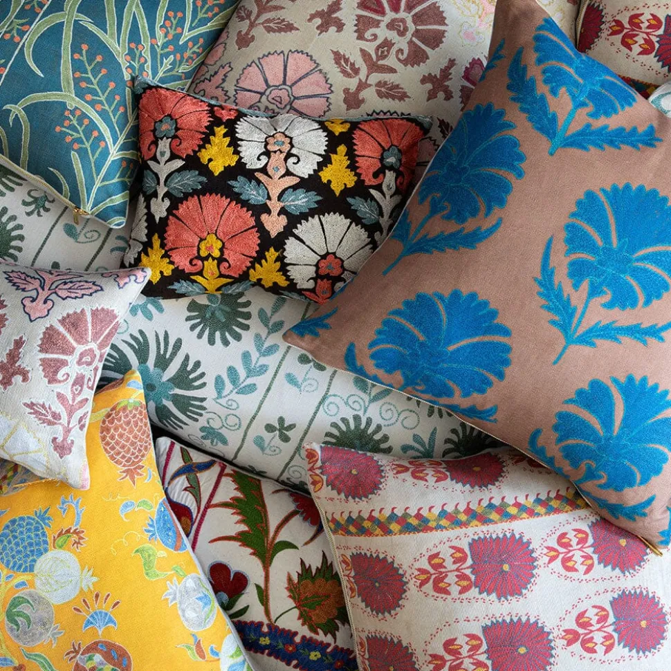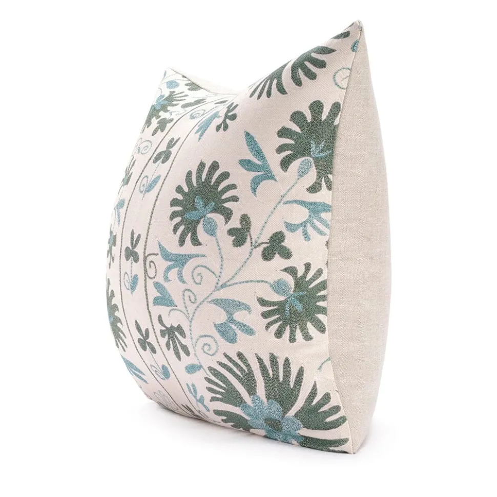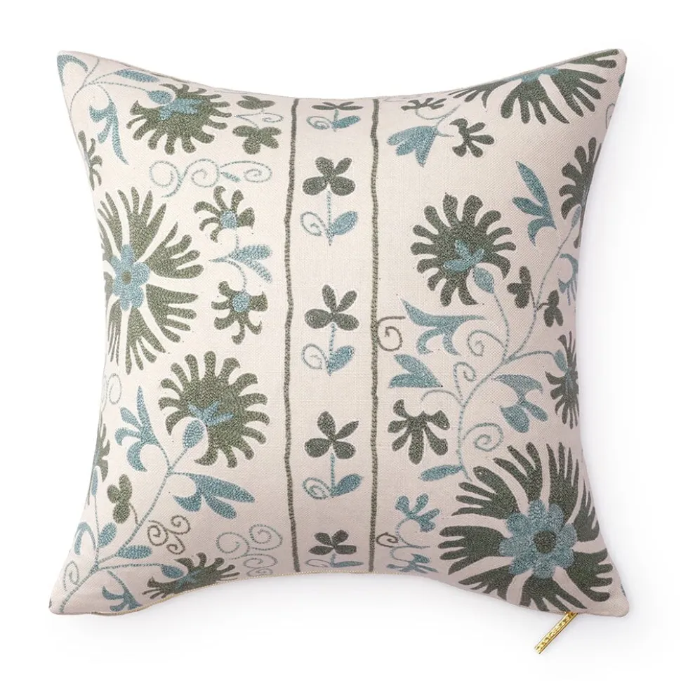 Citing unique origins and ethical sourcing, St. Frank produces contemporary, vintage, and printed homewares that carry with them the cultural history of the community from which it originates. Working with artisans in under-resourced settings, and only the utmost quality materials, St. Frank marries a sophisticated aesthetic with sustainable social change. Inspired by suzani embroidery, a classic Central Asian textile characterized by flowers and meandering vines, the Sage Ribbon Suzani Pillow is an elegant, inspiring addition to any room.