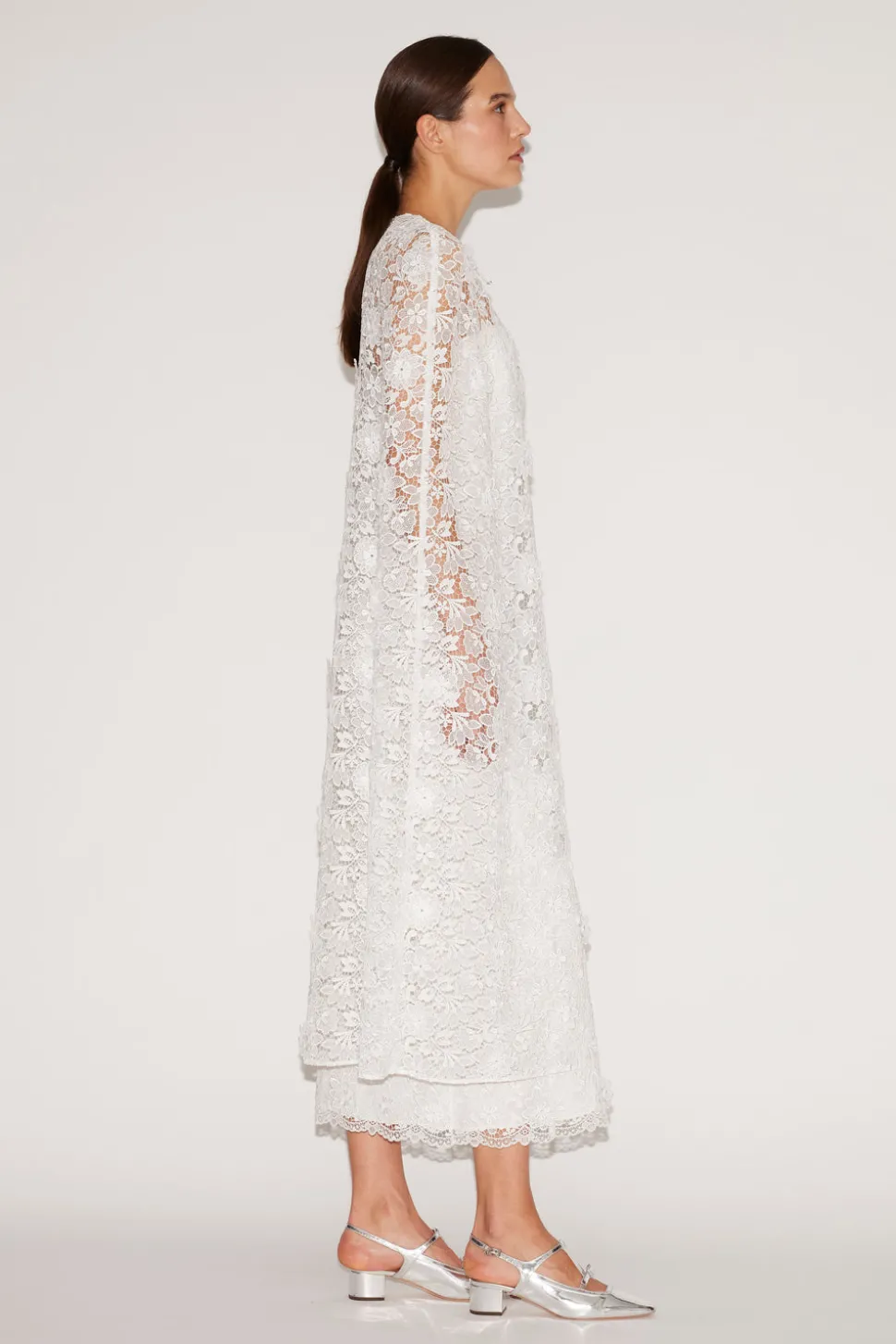 The London-based luxury brand, Huishan Zhang, was launched in 2011. As a Chinese-born designer, Huishan combines his heritage with Western influences to create a sophisticated, signature style. The Samantha Cape in White Lace is a sheer layering piece crafted from intricate floral lace, designed to elevate any ensemble with romantic elegance. Featuring a keyhole neckline tied with a soft bow, the cape’s fluid silhouette adds ethereal movement to both gowns and tailored separates.