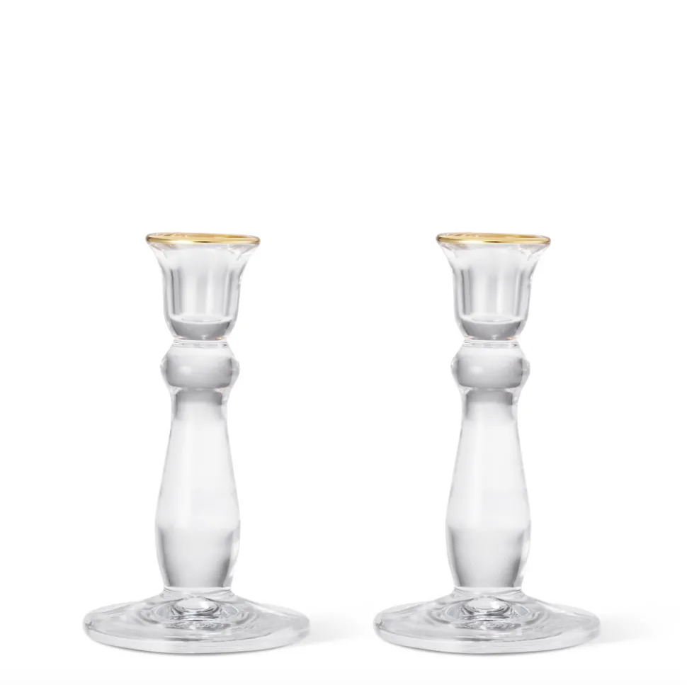 Effortless, beautiful living is what’s important to Aerin Lauder. That ease and refinement shines through in every detail of her collections of beauty products, home decor, and fashion accessories. Crafted in a classic shape, the Sancia Tall Taper Candleholders in Gold Rim, Set of 2 is an elegant addition to a table setting. Each candleholder is enhanced with a hand-painted gold rim creating a soft, warm glow.
