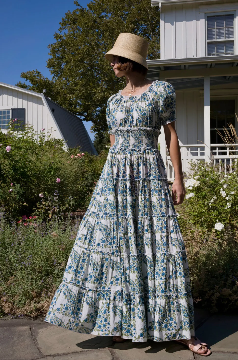 Hand printed on 100% cotton voile. Flattering smocked waistline. Opulent and twirl worthy. Hidden side seam pockets.