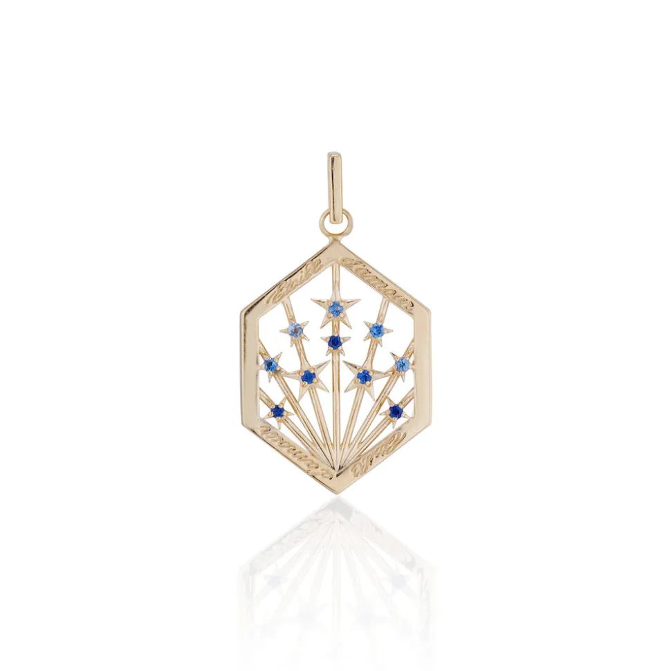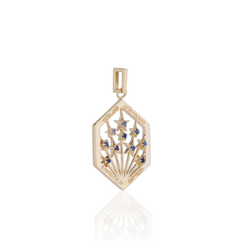 From her studio in New York City, Ashley Zhang designs one-of-a-kind fine jewelry that will last a lifetime. Inspired by 1960’s french charms, which were often inscribed with sweet sentimental phrases, the Sapphire Star Love Token says “Etoile D’Amour”, meaning star of love. Crafted in 14 karat gold, it features features stars set with vibrant blue sapphires and is set on the brand’s signature rectangle bail, allowing for the charm to slide on most small to medium chains.