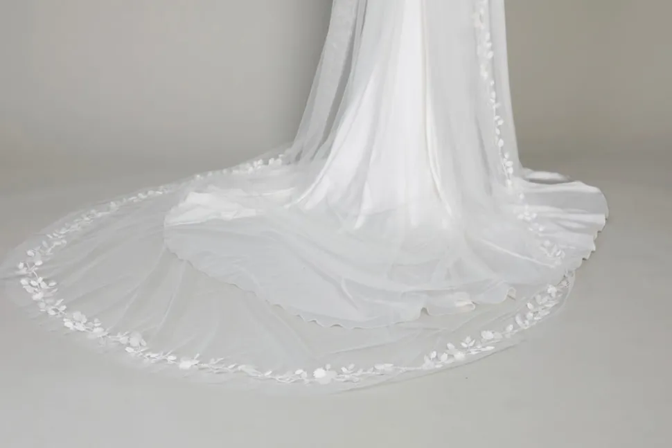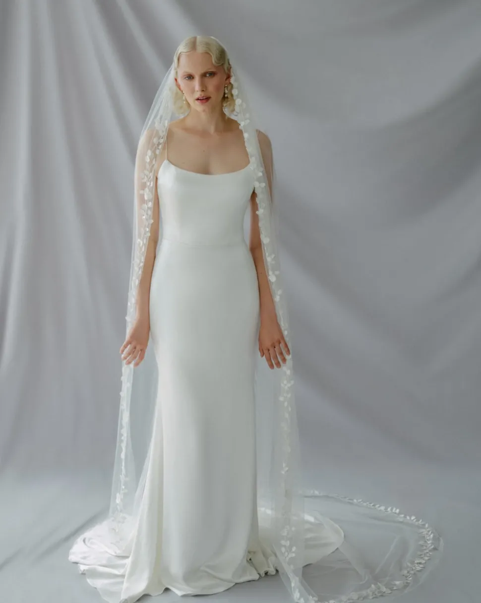 Launched in 2015, Alexandra Grecco’s namesake bridal line is quintessentially modern, while embracing the sophistication of traditional gowns. Her refined aesthetic is complemented by 100% silk crepe, and bolstered by the highest quality fabrics, the embrace of textures and richly embroidered 3D florals. With a name inspired by the poets of ancient Greece, the Sappho Veil boasts lyrical satin flowers hand-embroidered along the border.
