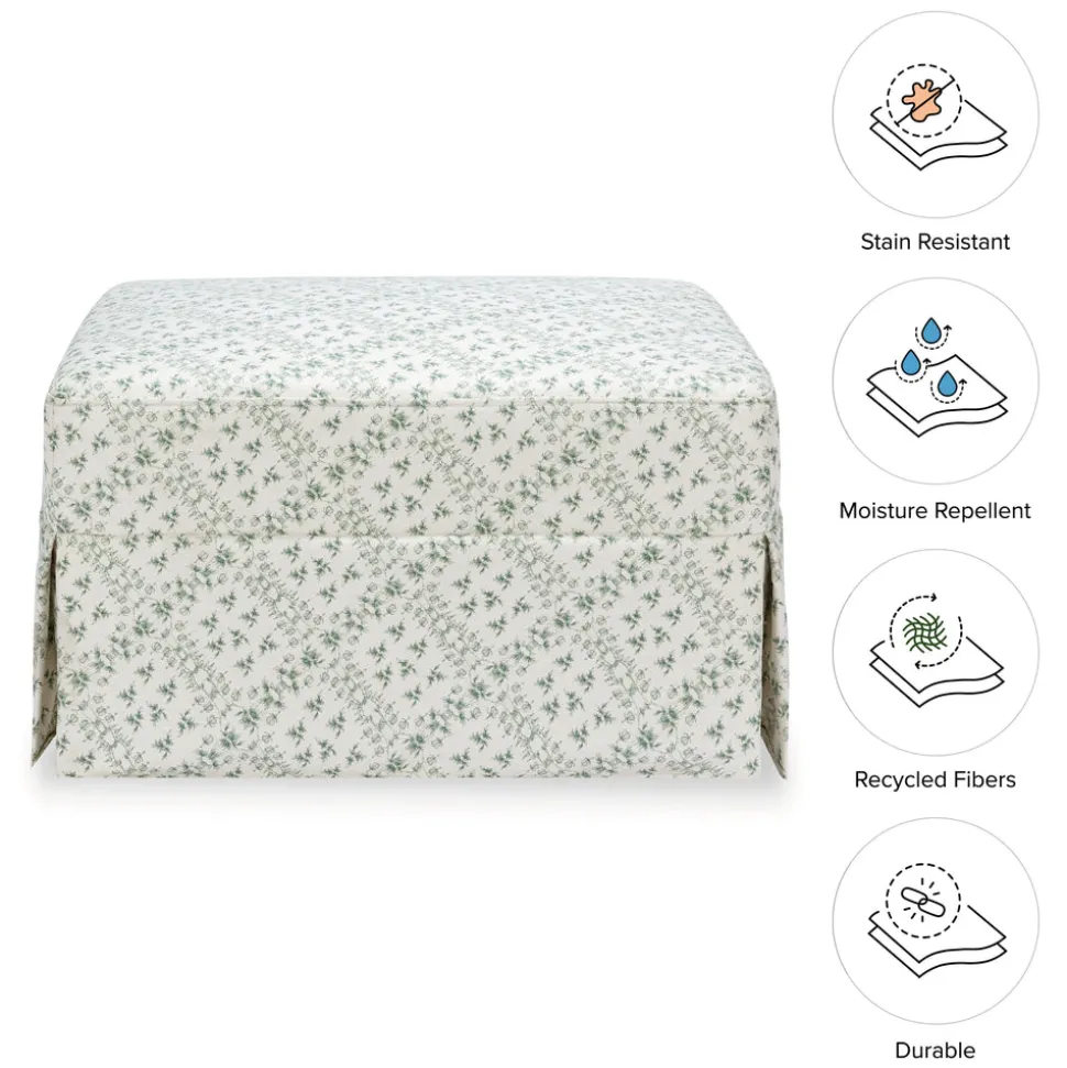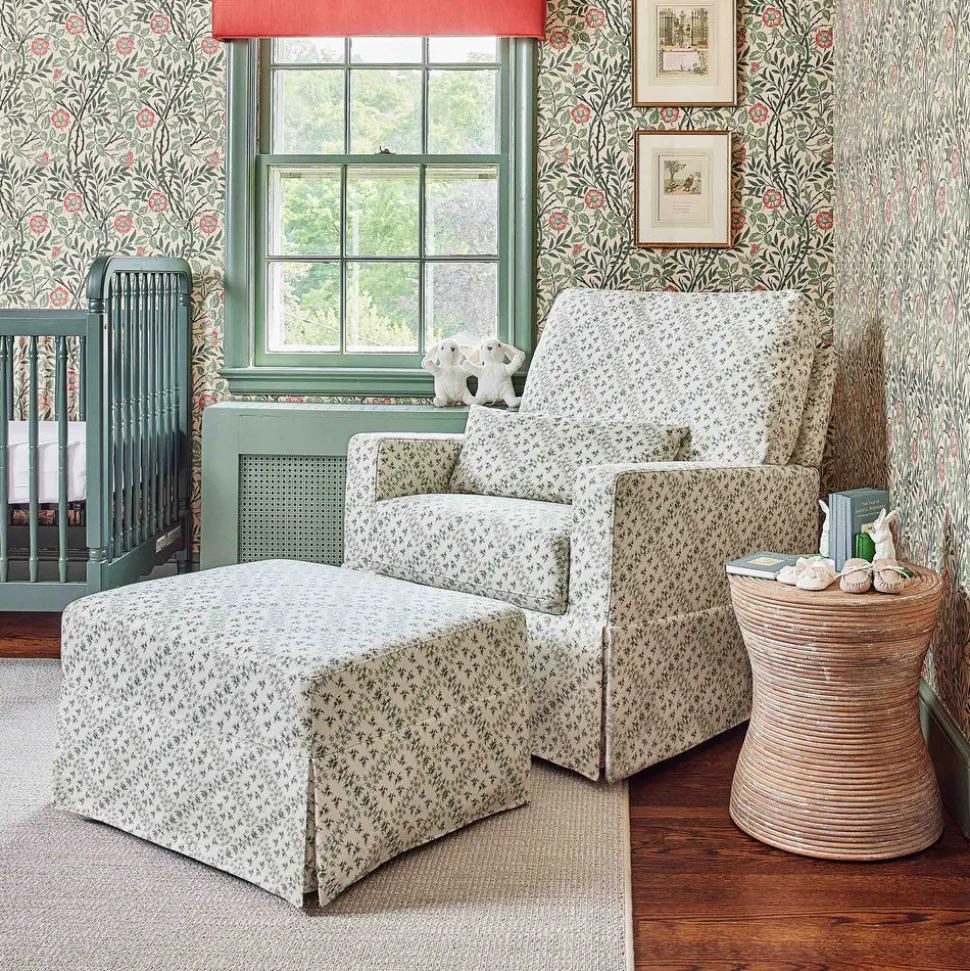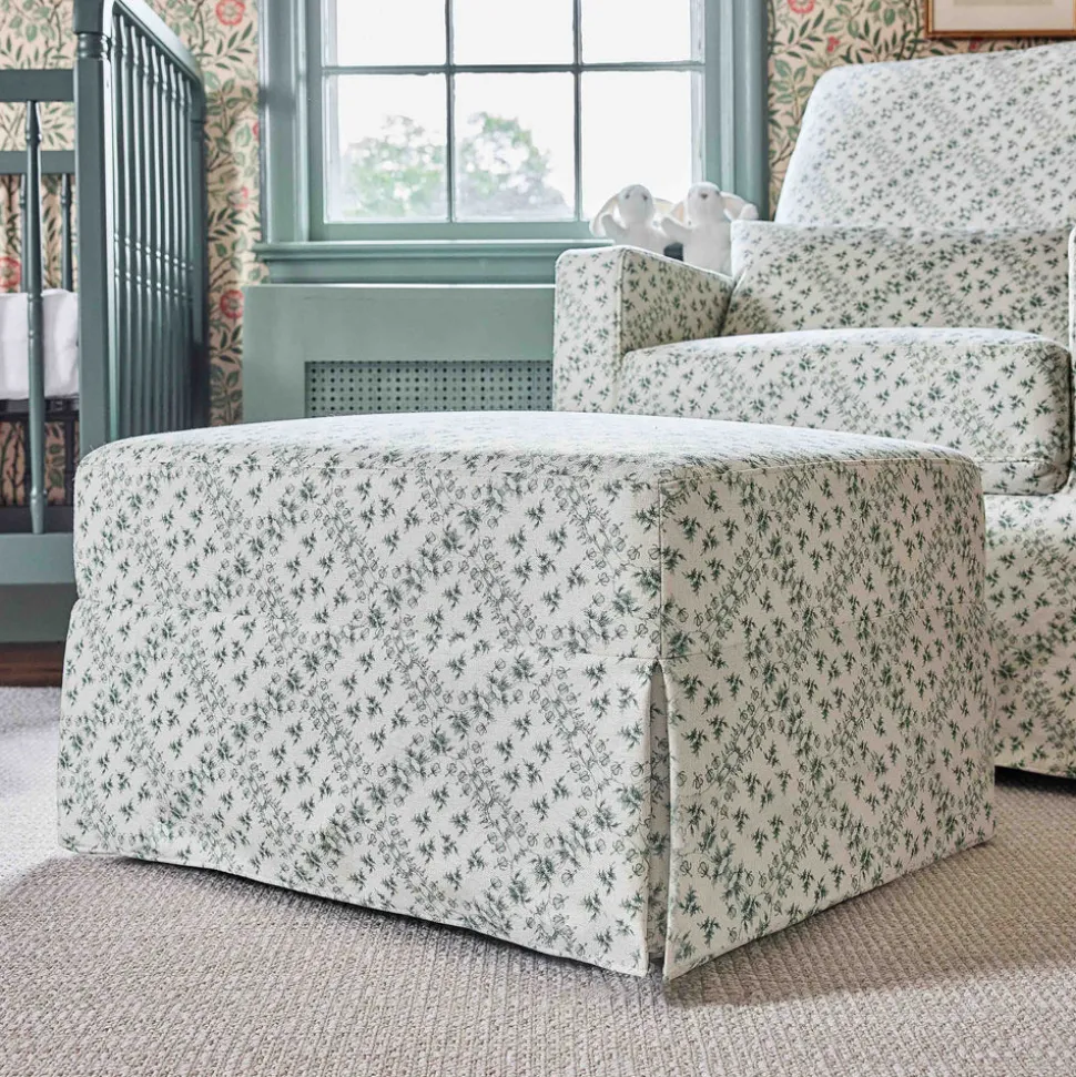 Made to treasure, Namesake brings quiet sophistication to the nursery and beyond. Imbuing heirloom-quality craftsmanship with modern sensibility, these timeless essentials are made to be cherished for years to come. The Sarah Flint x Namesake Crawford Gliding Ottoman in Green Lattice Performance Eco-Weave reflects the signature elegance of designer Sarah Flint, blending traditional charm with modern functionality. Paired with the coordinating Crawford Glider, the ottoman’s gentle motion helps create a calming rhythm for bedtime routines.