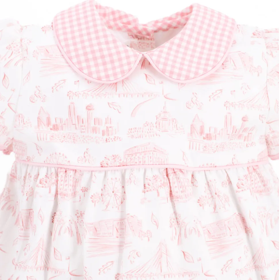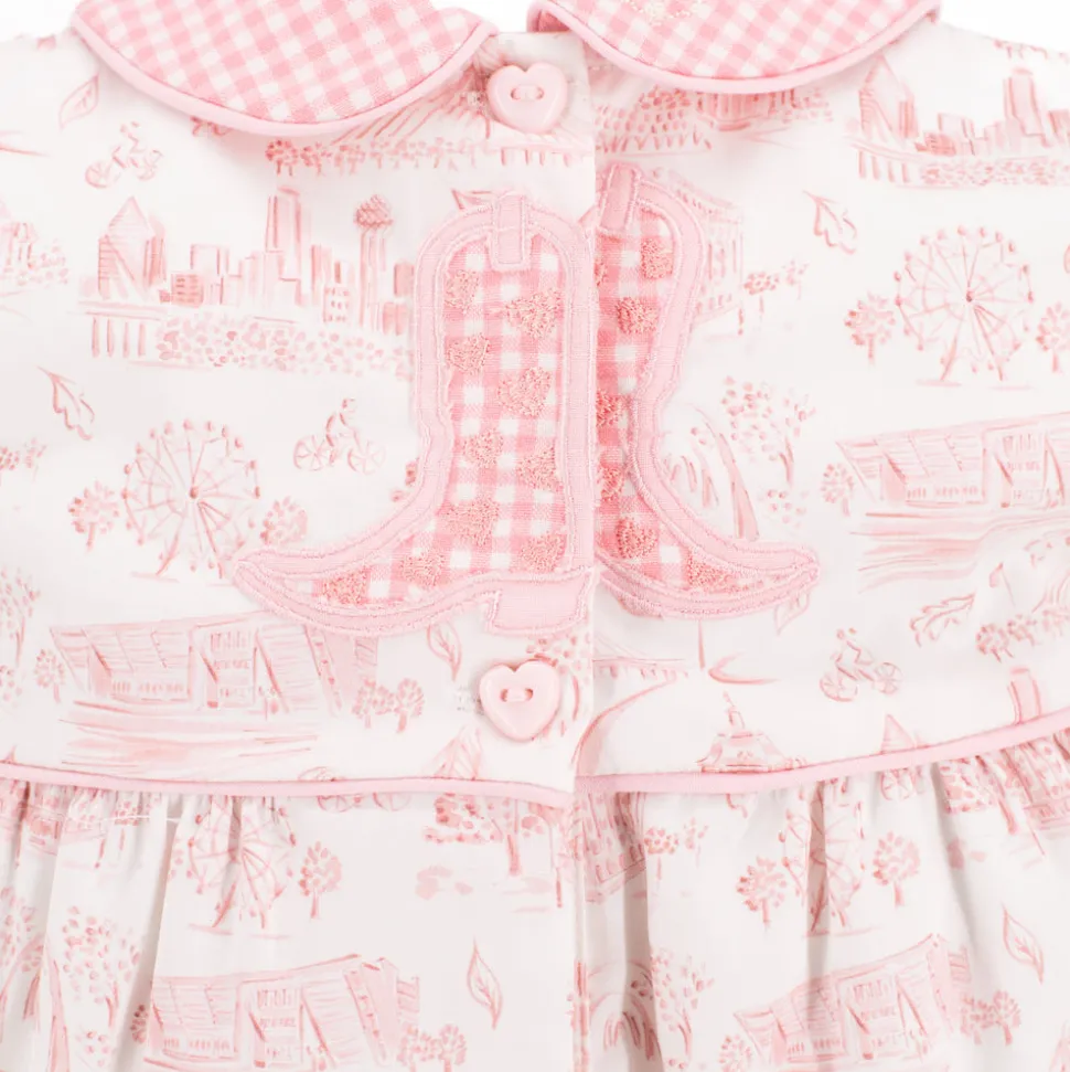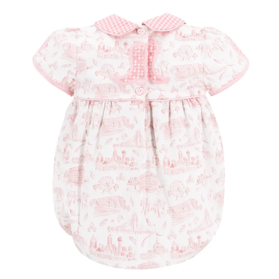 Inspired by the beauty of motherhood, Dondolo is a luxury lifestyle brand that provides beautiful, heirloom-quality clothing for generations to come. Each design is thoughtfully crafted in Colombia with ethical manufacturing, making every piece even more special. Say howdy to the Sarita Girl Bubble in Dallas Print. This piece is adorned with tiny hand-embroidered hearts on the boot.