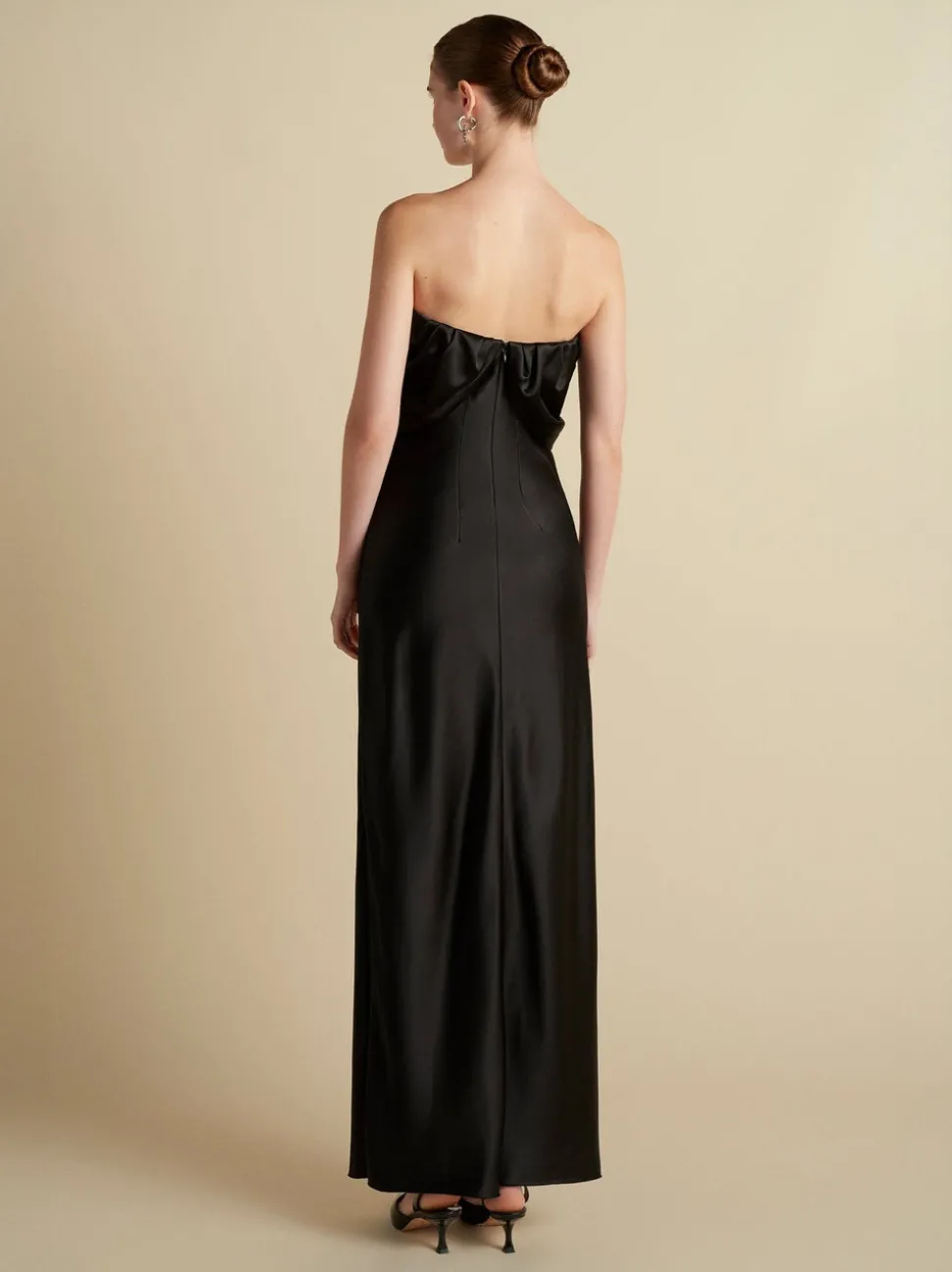 Founded in 2016 by sisters Marina and Francesca Moscone, the label gravitates toward a tactile approach, twisting and draping fabrics by hand to create a softly seductive design using custom jacquards, fil-coupés, and silk wools, all exclusively developed in Italy, rendered in precise shapes and tailoring. The Satin Draped Bustier Dress in Black embodies this vision with a fluid draped neckline and interior bustier construction for sculpted support. A side slit lends movement to the full-length silhouette, while the center back zipper ensures a refined finish.