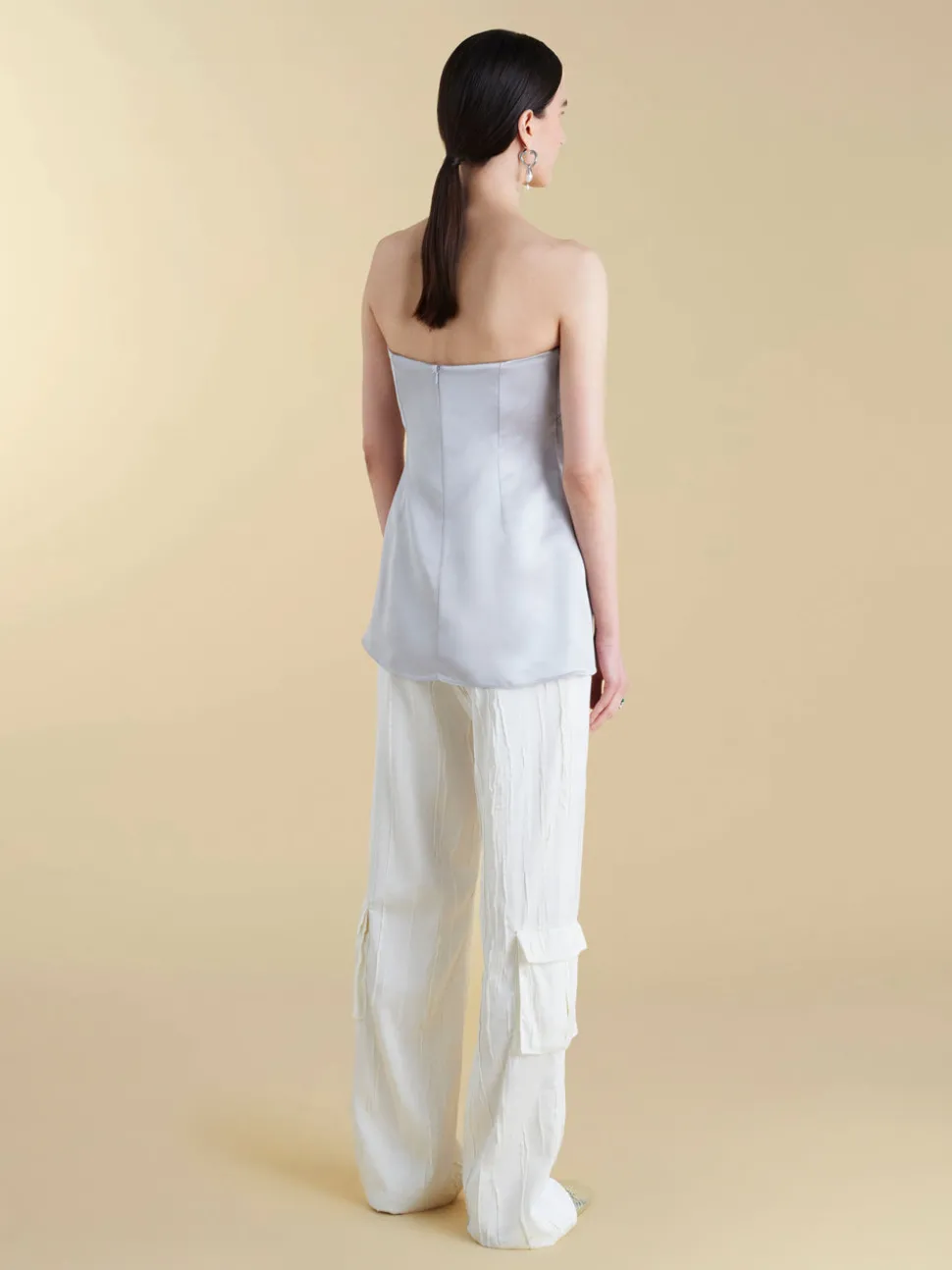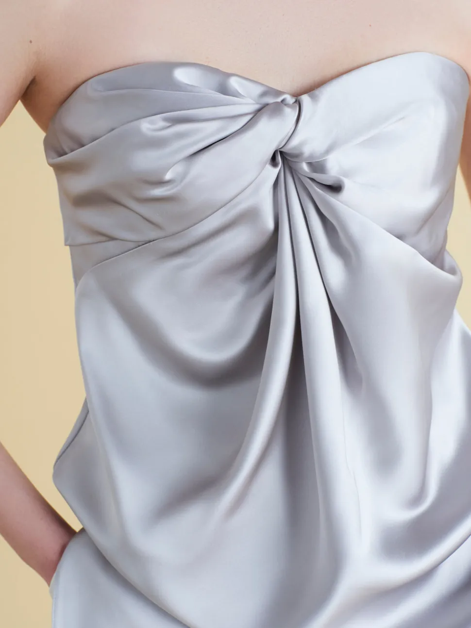 Founded in 2016 by sisters Marina and Francesca Moscone, the label gravitates toward a tactile approach, twisting and draping fabrics by hand to create a softly seductive design using custom jacquards, fil-coupés, and silk wools, all exclusively developed in Italy, rendered in precise shapes and tailoring. The Satin Twist Bustier in Grey highlights the brand’s signature artistry with hand-twisted draping across the bodice and an internal structure that sculpts and supports.
