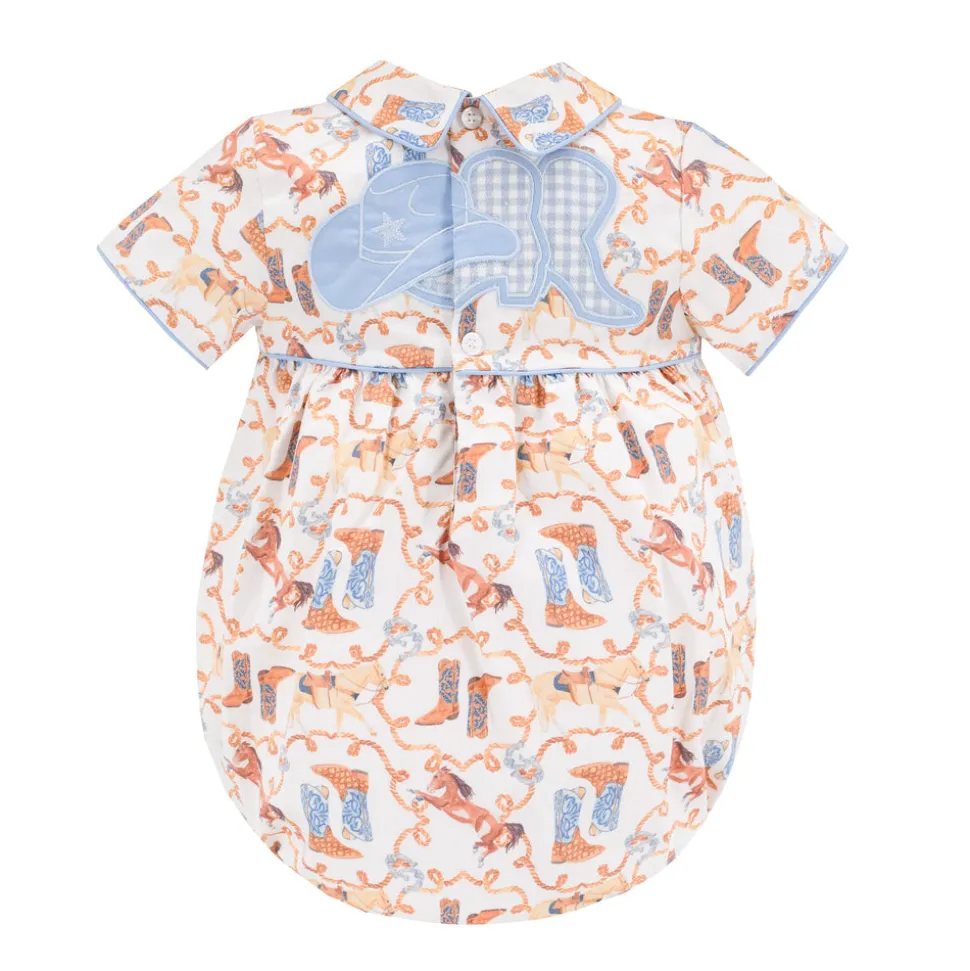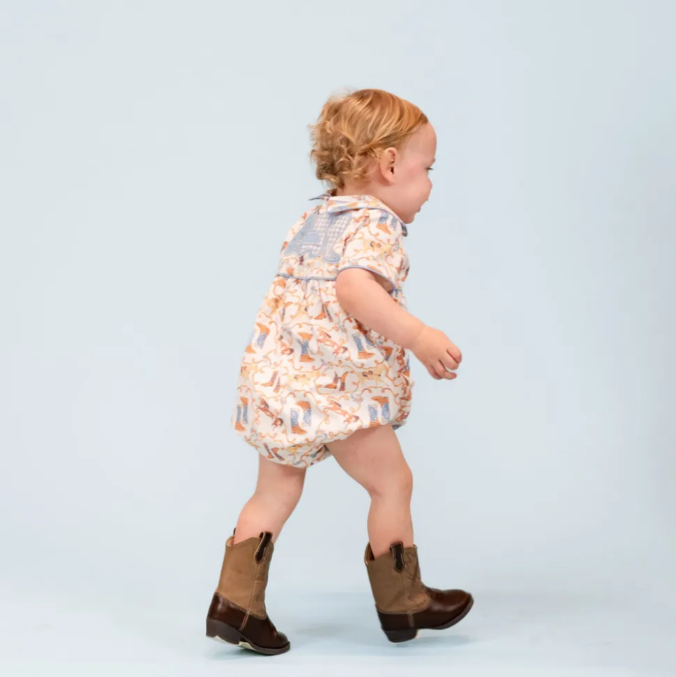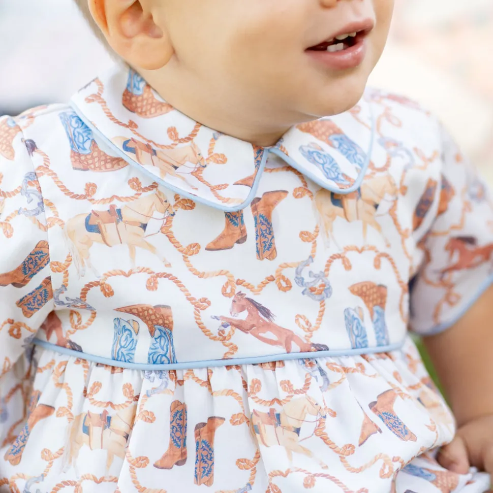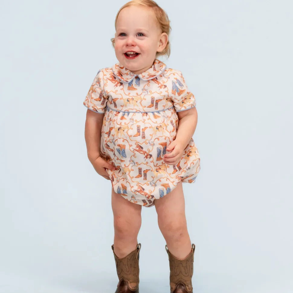 Inspired by the beauty of motherhood, Dondolo is a luxury lifestyle brand that provides beautiful, heirloom-quality clothing for generations to come. Each design is thoughtfully crafted in Colombia with ethical manufacturing, making every piece even more special. A beloved bestseller, the Sawyer Boy Bubble returns in a charming new print, full of Western spirit and nostalgic detail. Featuring an embroidered cowboy hat and boots on the back—lined with blue gingham for added whimsy—this keepsake piece is finished with delicate blue piping at the chest and a classic Peter Pan collar. It’s a picture-perfect choice for milestone moments and everyday adventures alike.
