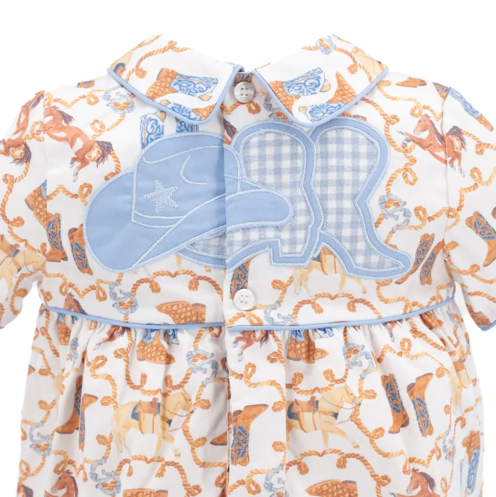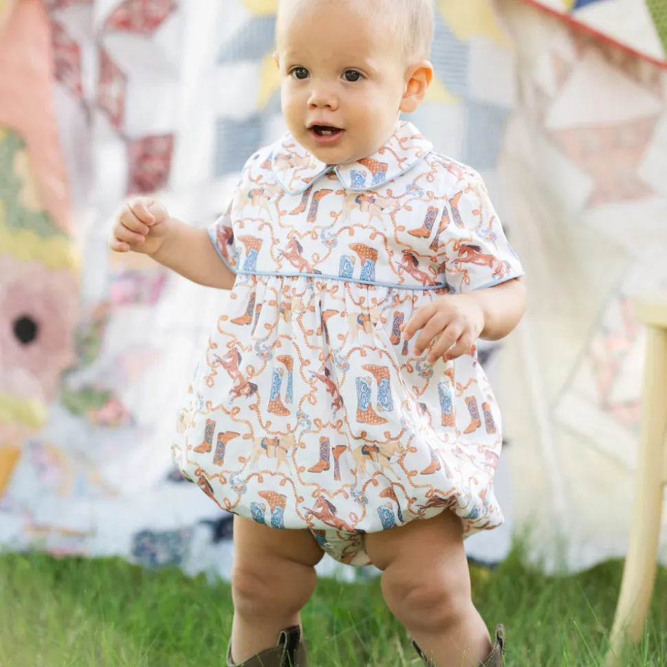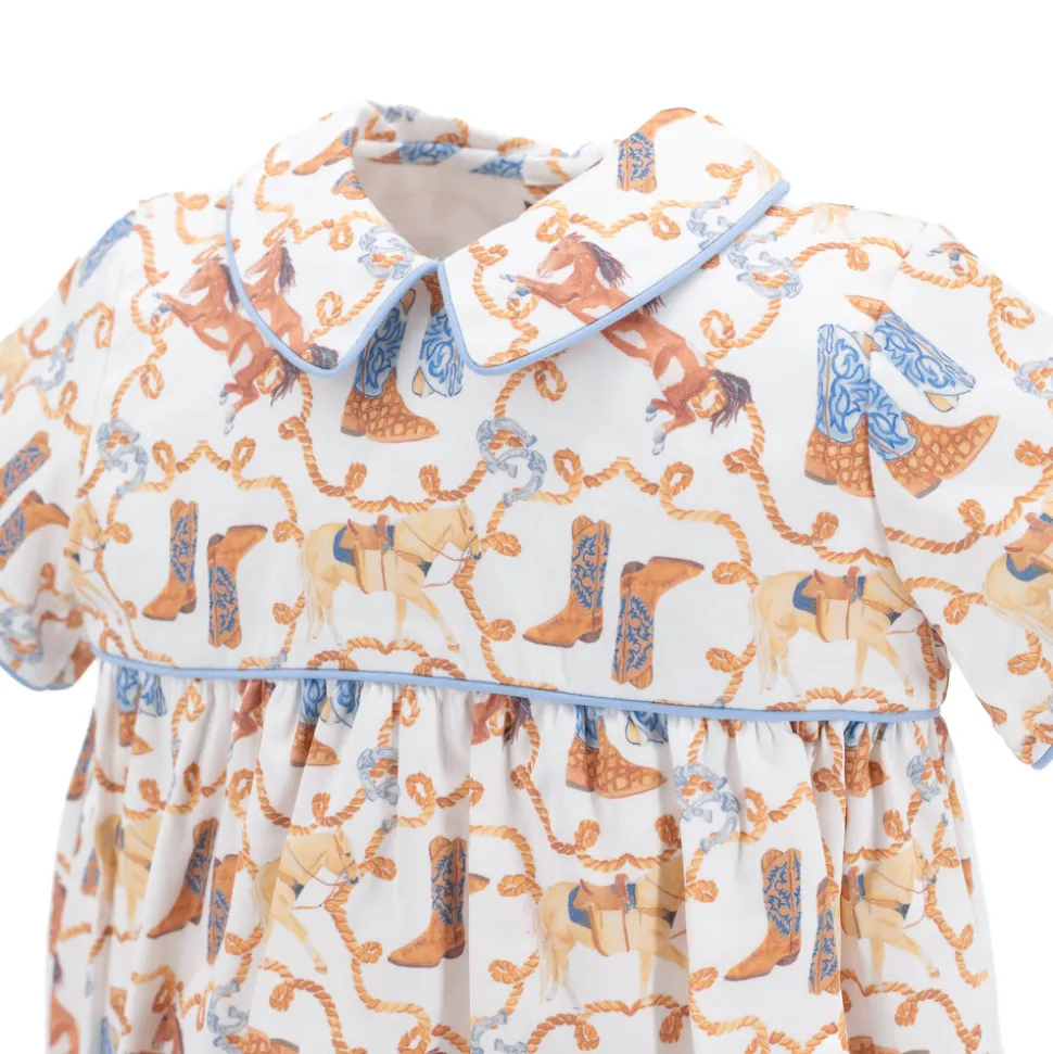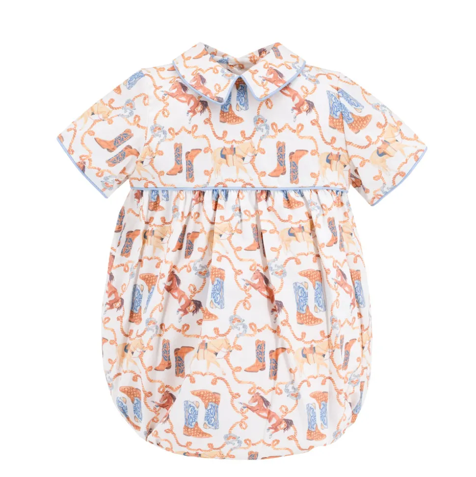 Inspired by the beauty of motherhood, Dondolo is a luxury lifestyle brand that provides beautiful, heirloom-quality clothing for generations to come. Each design is thoughtfully crafted in Colombia with ethical manufacturing, making every piece even more special. A beloved bestseller, the Sawyer Boy Bubble returns in a charming new print, full of Western spirit and nostalgic detail. Featuring an embroidered cowboy hat and boots on the back—lined with blue gingham for added whimsy—this keepsake piece is finished with delicate blue piping at the chest and a classic Peter Pan collar. It’s a picture-perfect choice for milestone moments and everyday adventures alike.