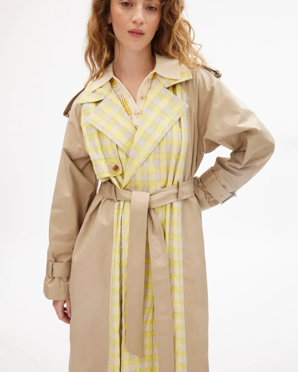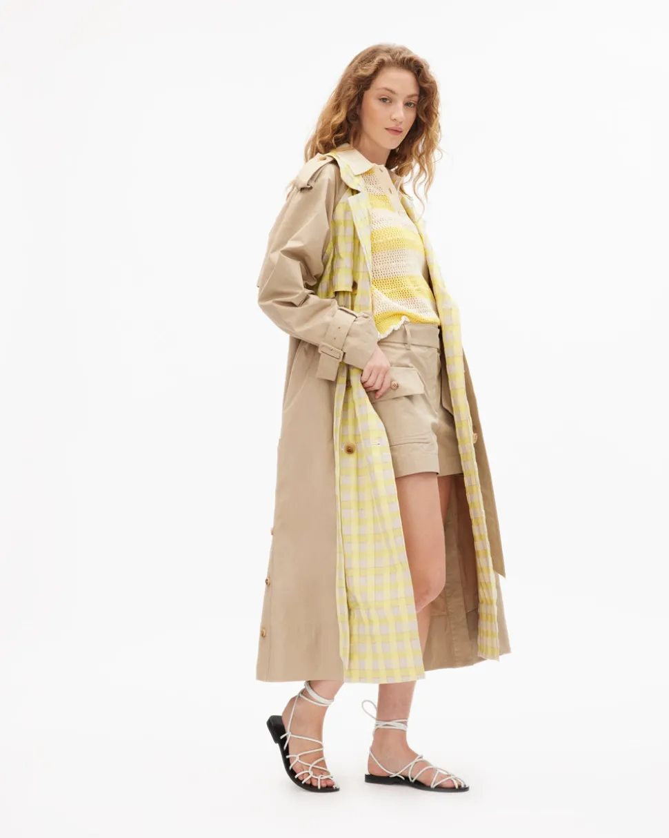 Creating clothing that inspires confidence, celebration, and community, Tanya Taylor is a New York-based womenswear brand whose mission is to provide practicality and style to a range of ready-to-wear in inclusive sizes. Each collection is thoughtfully designed through the artful use of color, texture, and original hand-painted prints. The Sawyer Coat in Dark Khaki/Lemon Multi is a statement cotton trench. It is an oversized silhouette with novel gingham contrasts for a twist on classic outerwear. Featuring thoughtful details throughout, from the adjustable buckle sleeves and removable belt to the functional button up side slits, it lends a sophisticated yet playful ease to everyday dressing.