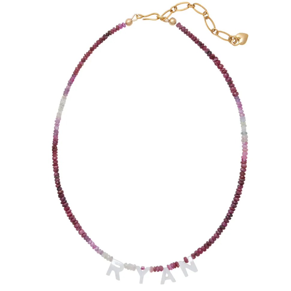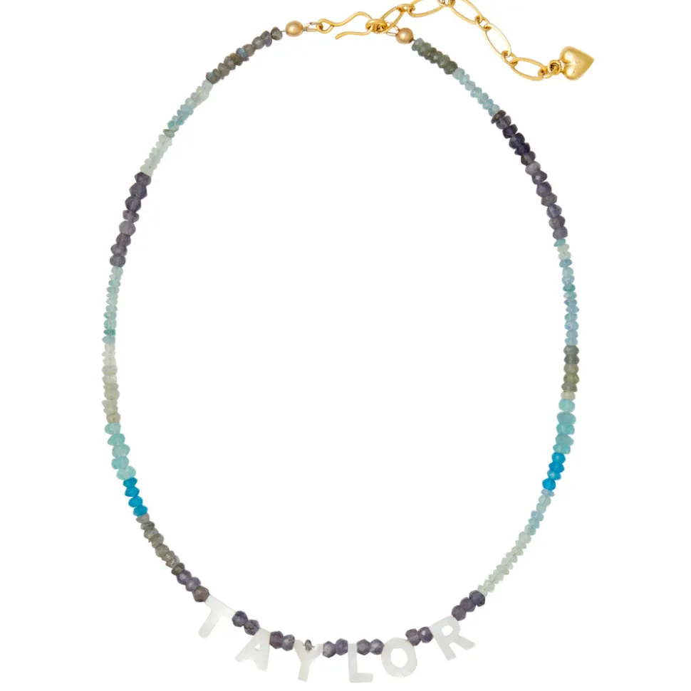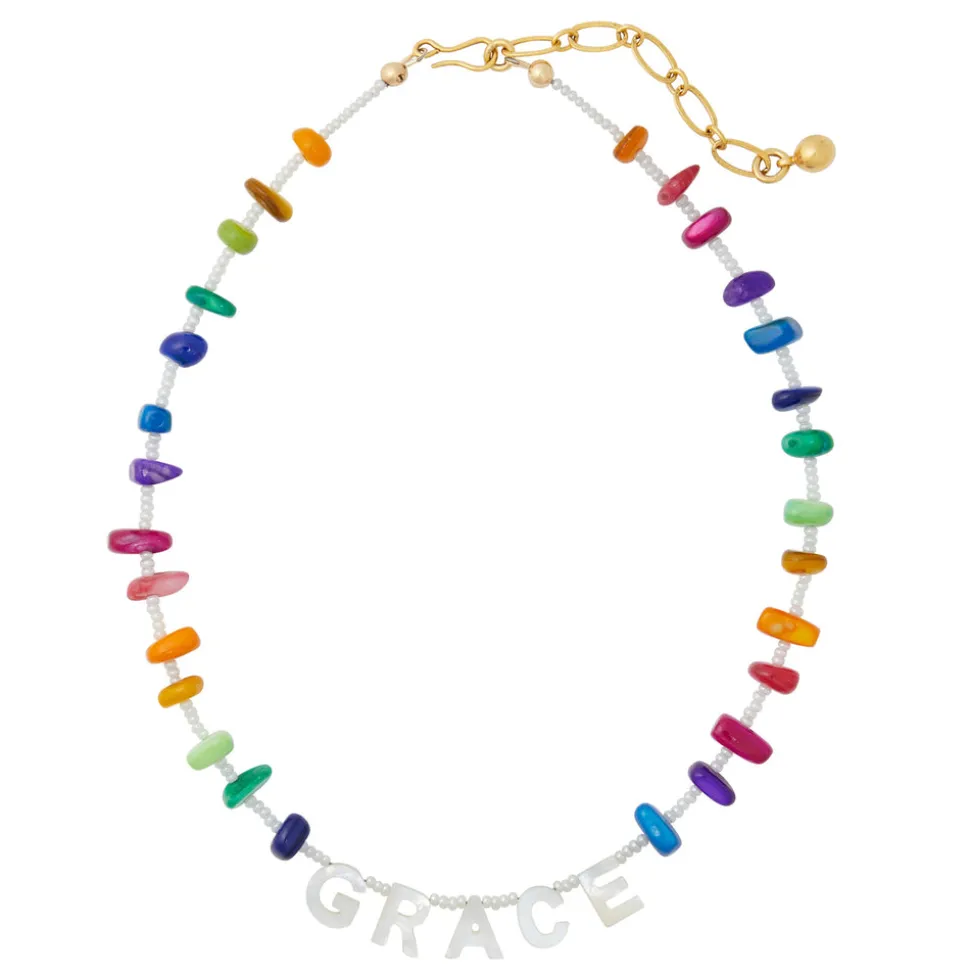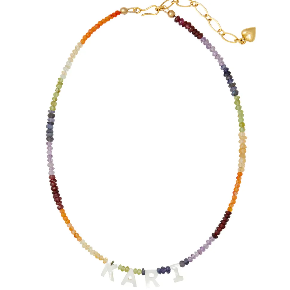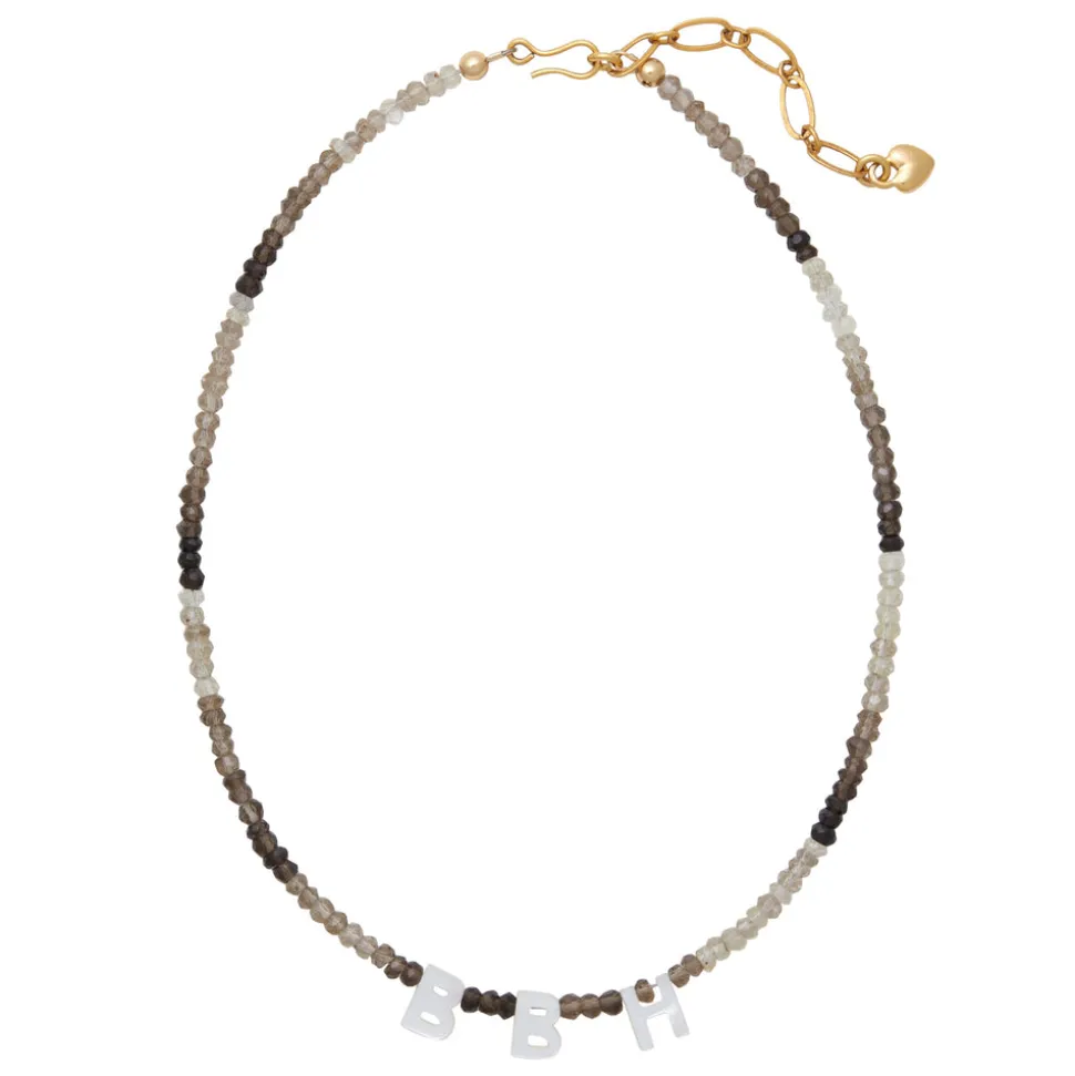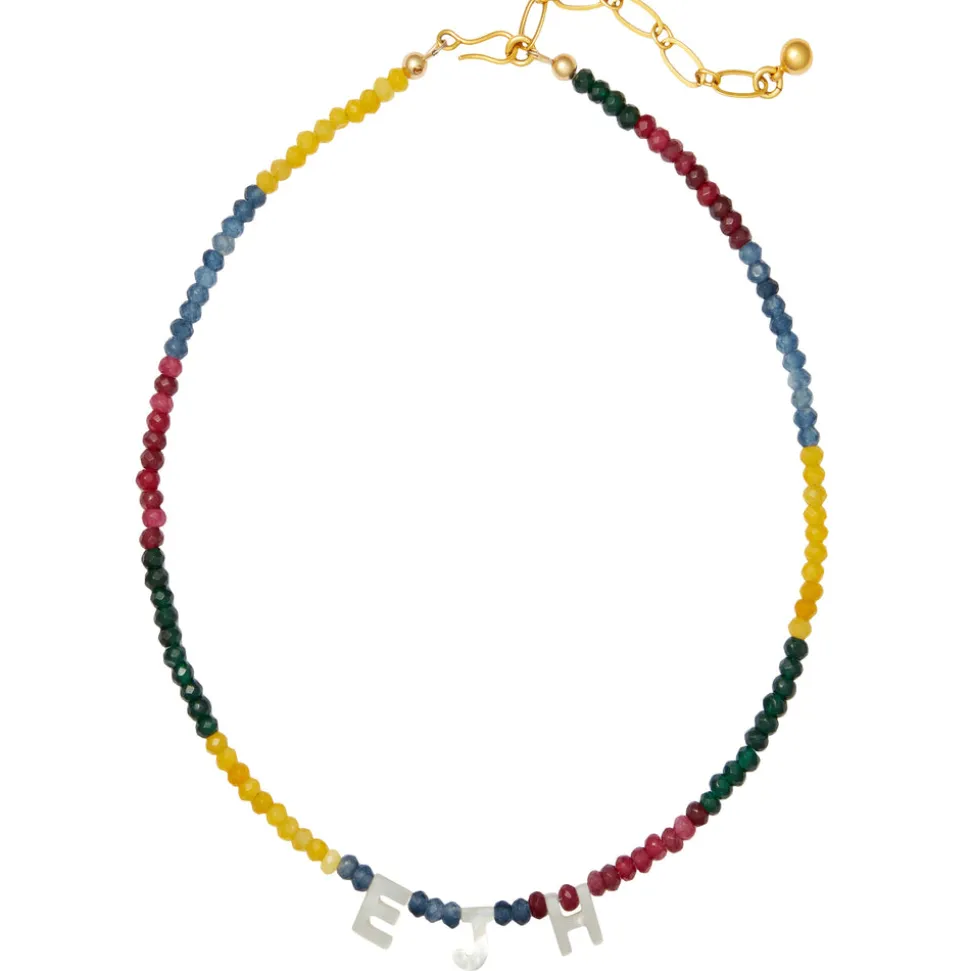 Mother-of-pearl letters. Semi-precious beads. 24K gold-plated, brass chain.