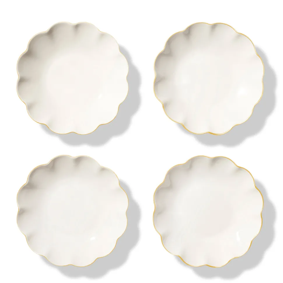 The Scalloped Appetizer Plates features high-fired ceramic finished with a clear glaze and gold trim, perfect for salads and appetizers.