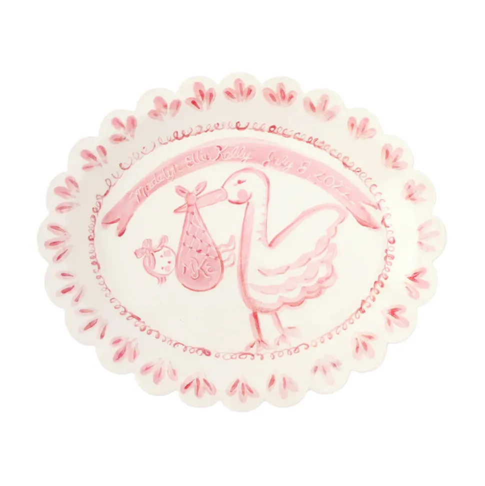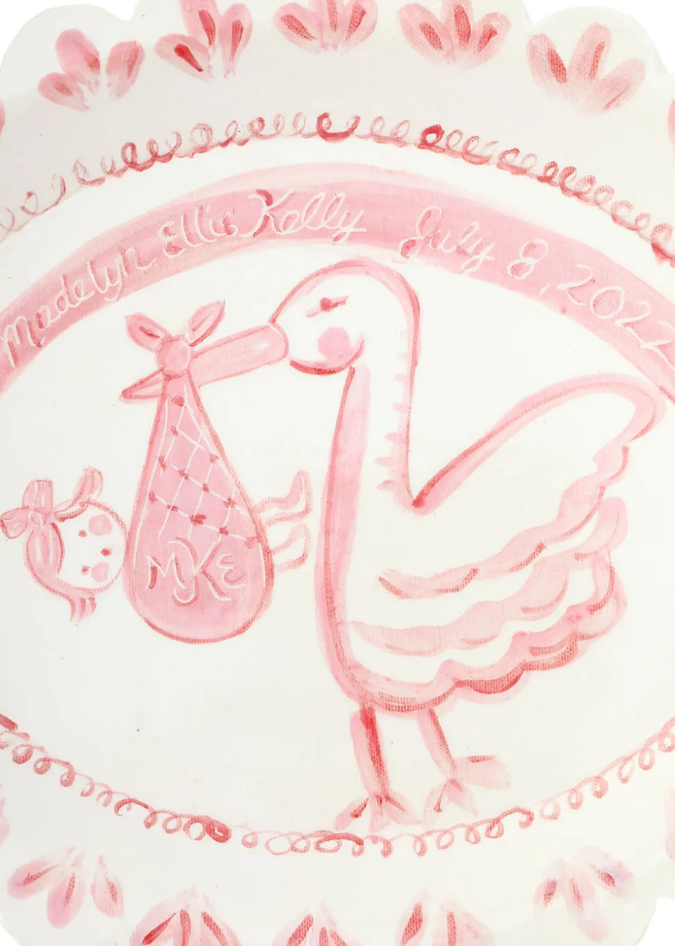 Self-taught artist Tricia Lowenfield crafts one-of-a-kind whimsical pieces that will become family treasures in time. The Scalloped Birth Plate in Pink celebrates the newest arrival in your life. Entirely handmade, the personalized details of this plate are etched into the clay before being fired in the kiln. Please specify baby’s full name and birth date.