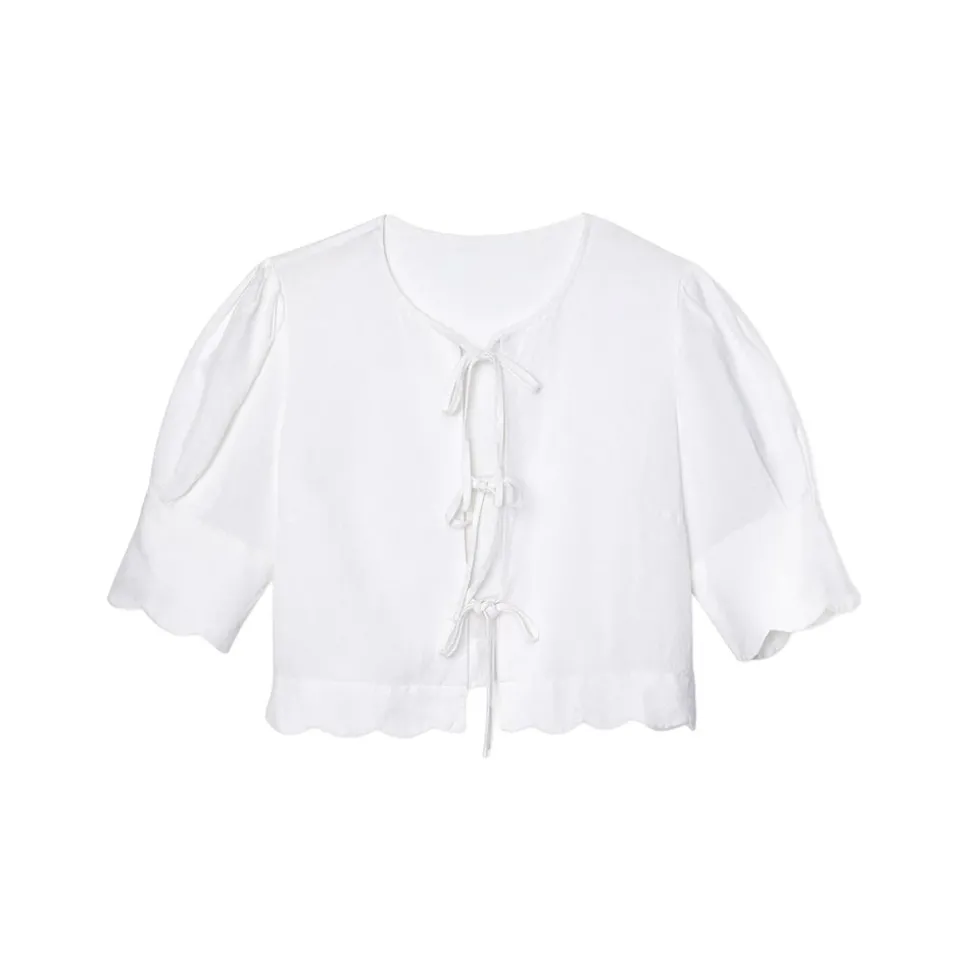 Michelle Marie, founder of Sister Swim, built her brand around her vision of swimwear’s fundamentals: style, innovation, comfort, and confidence. Boasting clean lines, precise measurements, and unique prints, her collections do not stand out from the wearer but instead accentuate her natural beauty. The Scalloped Top in White is a cropped blouse with a delicate and feminine design. It features short puffed sleeves and a scalloped hem. The front of the blouse has a lace-up detail with thin ties, creating a stylish and slightly open look. The overall aesthetic is vintage-inspired, with a romantic and summery feel.