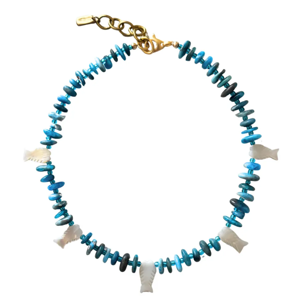 Natural blue chip beads and mother of pearl fish pendants. Includes 2″ extender for adjustable length.