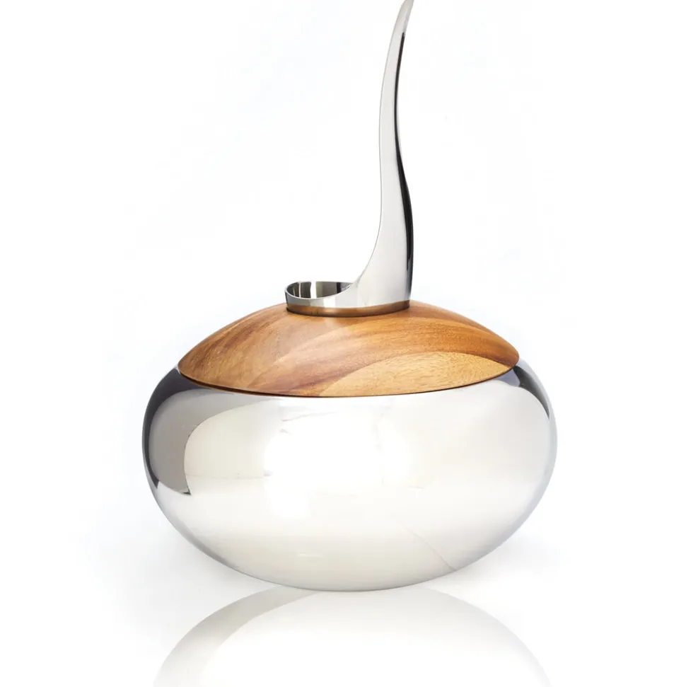 Recognized for over 60 years of award-winning design, Nambé blends timeless, refined beauty with everyday function. With pieces featured in world-renowned museums, its serveware, barware, home decor, and gifts reflect a legacy of artistry and innovation. A functional sculpture, the Scoop Ice Buckets pleasing curves wrap and cradle the ice, keeping everything inside nice and cool late into the night. When not in use the scoop rests on its wooden lid, creating an added sense of intrigue.