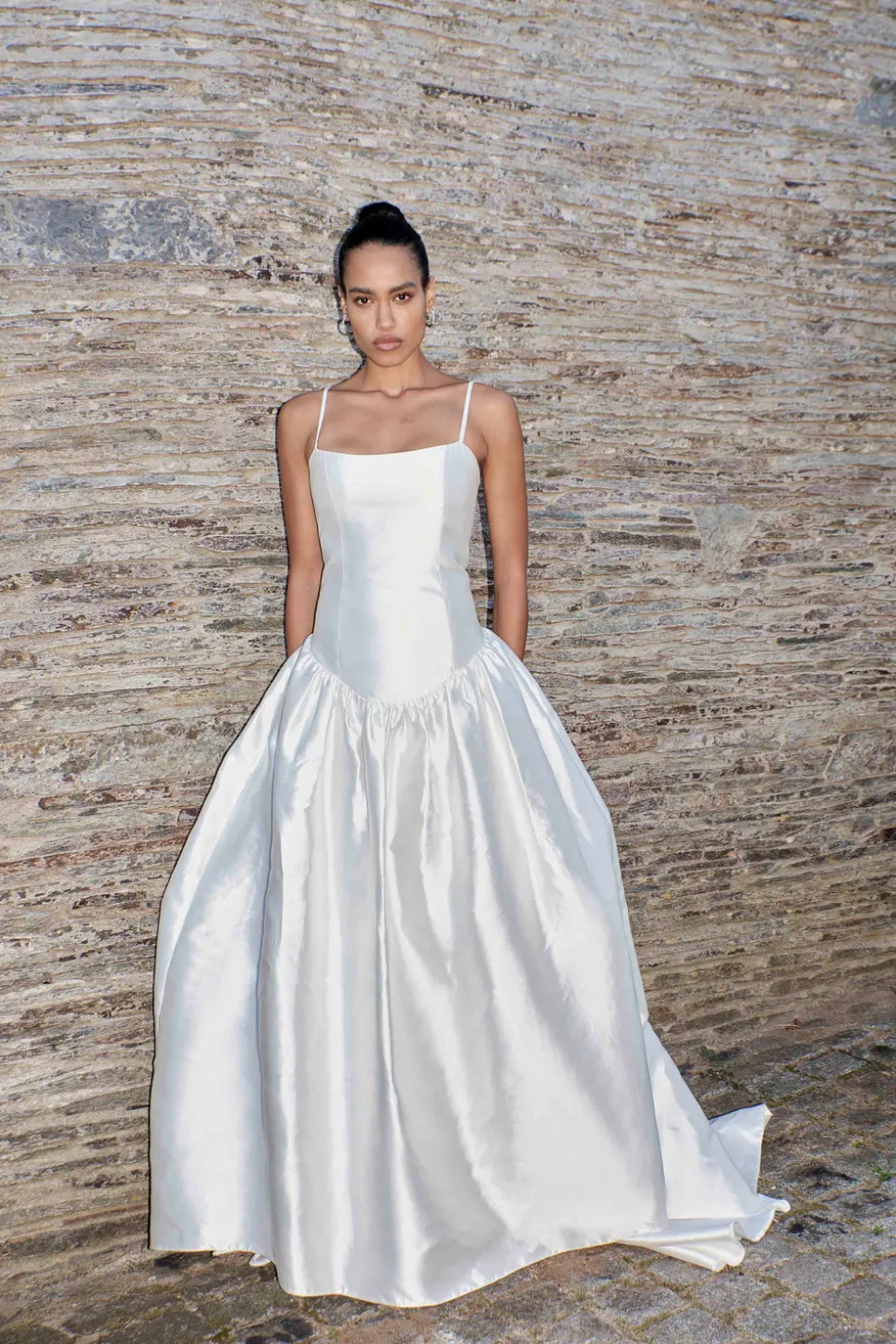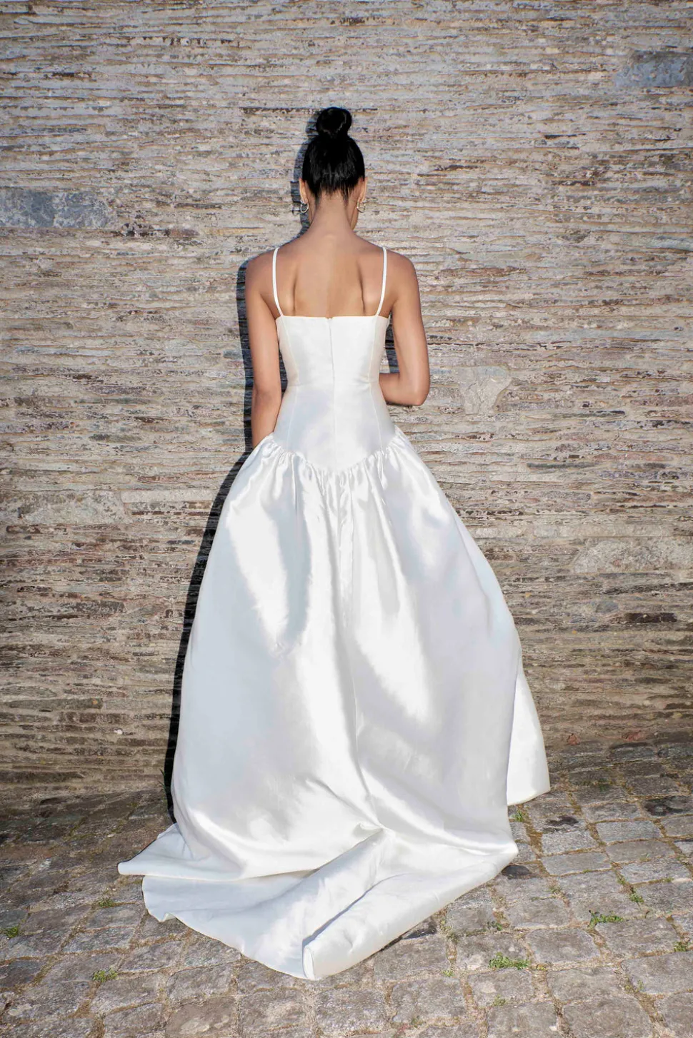 Handmade at its London atelier, The OWN Studio’s signature style combines pared-back, contemporary silhouettes with unexpected vintage details resulting in considered, minimal styles for the modern woman. The label brings a fresh and contemporary approach to wedding and evening wear. A unique take on the traditional bridal silhouette, the low soft scoop neckline and drop waist keeps the Scoop Neck Silk Mikado Drop Waist Dress | STYLE 075 feels ultra contemporary and adds an air of nonchalance to the outfit. Crafted from the most incredible silk mikado, the subtle seaming detail and structured fit of this wedding dress means it is incredibly flattering. Pair with a sleek bun and gold hoops for the most refreshing of bridal looks.