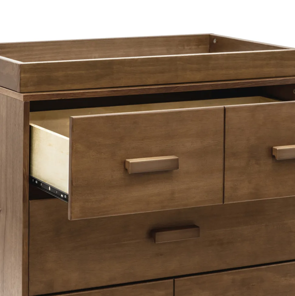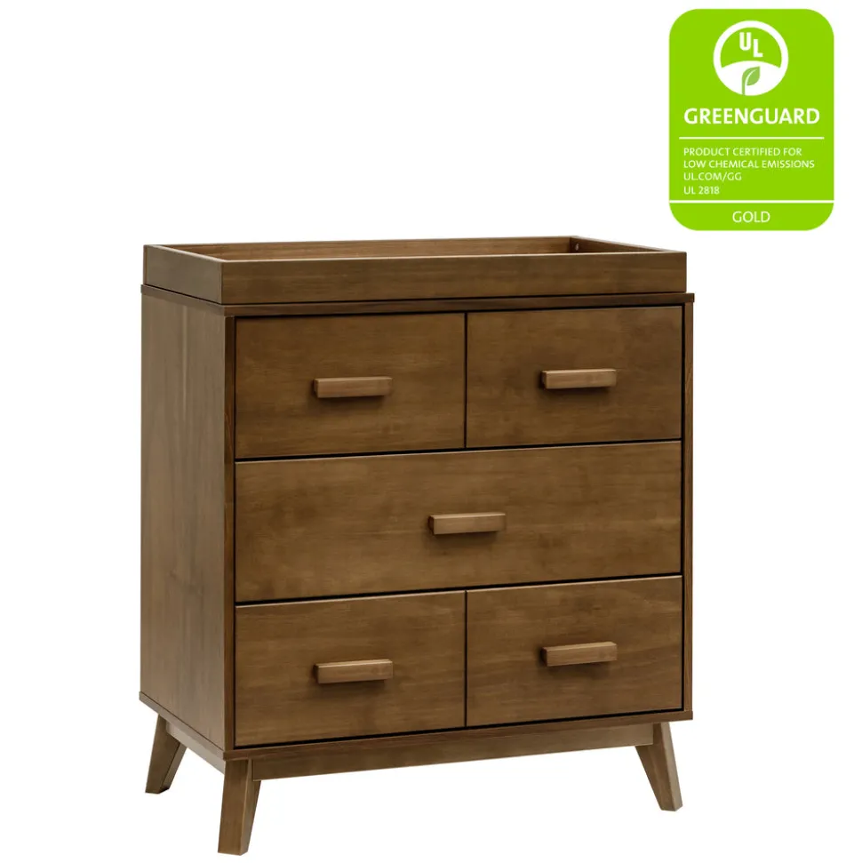 Natural walnut finish. Made with FSC®-certified sustainable New Zealand pine wood and TSCA-compliant engineered wood. GREENGUARD Gold Certified. Finished in a non-toxic multi-step painting and staining process that is lead and phthalate safe. Includes a removable changing tray. Three spacious drawers with pre-installed smooth metal glides and safety stops. Anti-tip kit included for added safety. Pairs with the Scoot 3-in-1 Convertible Crib.
