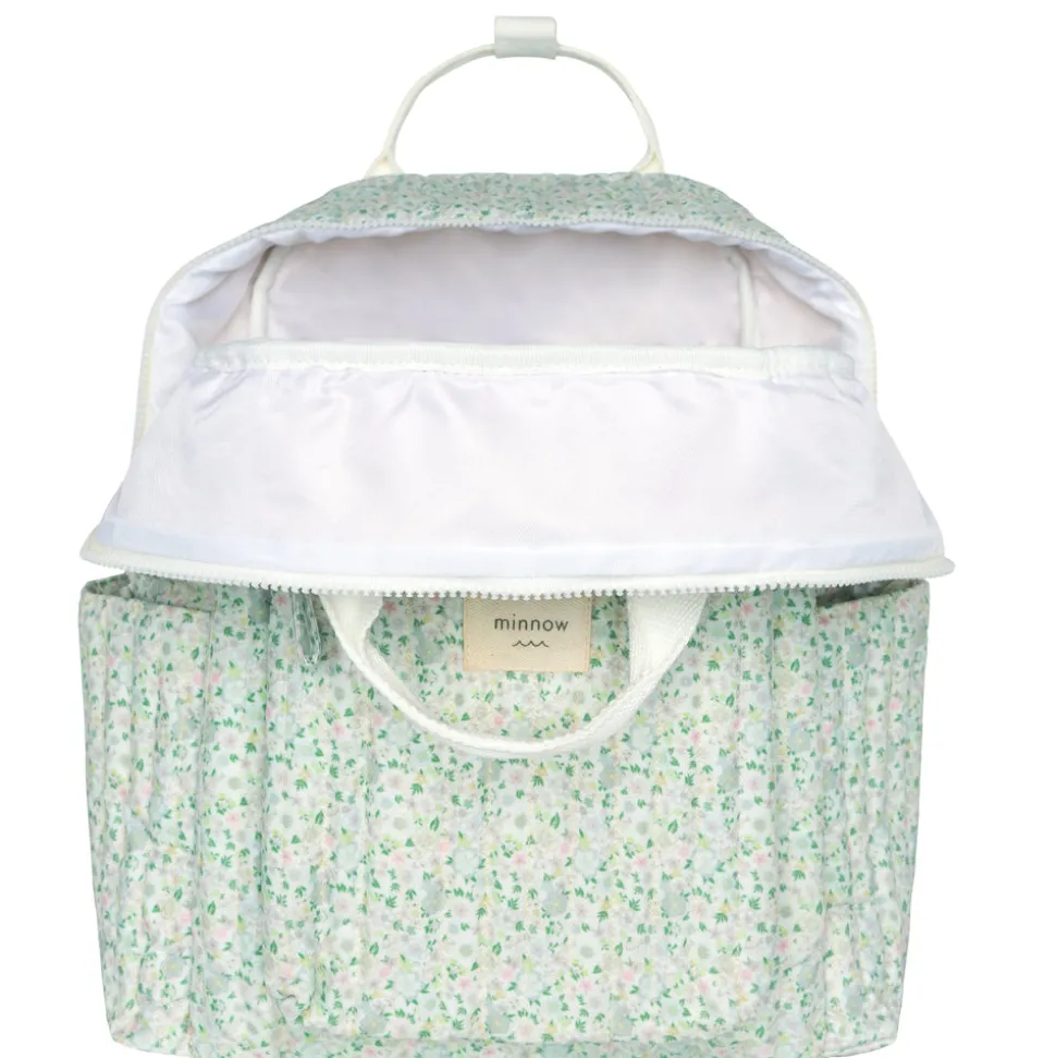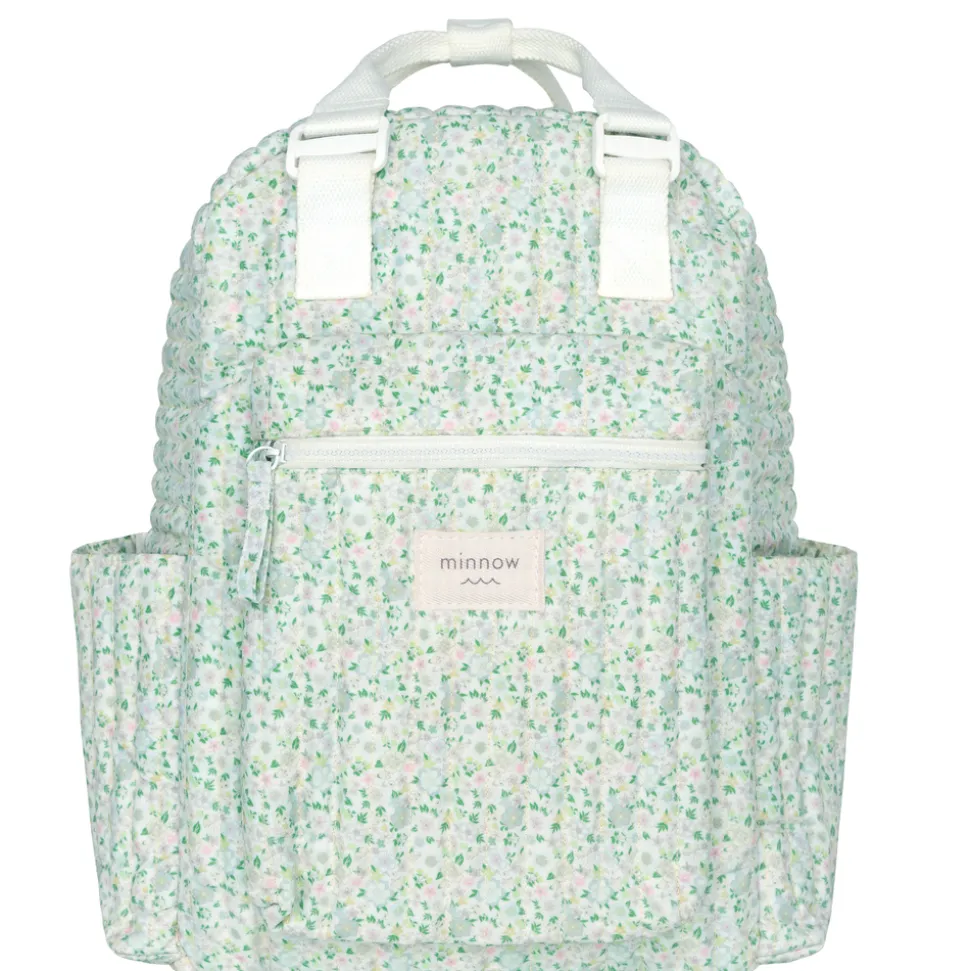A family favorite for its clean lines and simple details, minnow creates pieces that are playful, polished, and thoughtfully designed for long days, sandy toes, and the wonderment of life on the shore. The Sea Marsh Floral Coated Everyday Backpack is soft, quilted, and made with on-the-go lifestyles in mind. Ideal for everything from travel to the beach to school, this bag is thoughtfully designed with padded shoulder straps, convenient top-carry handles, two side pockets and a zippered front pocket, a lined interior, and a spill-proof coated exterior.