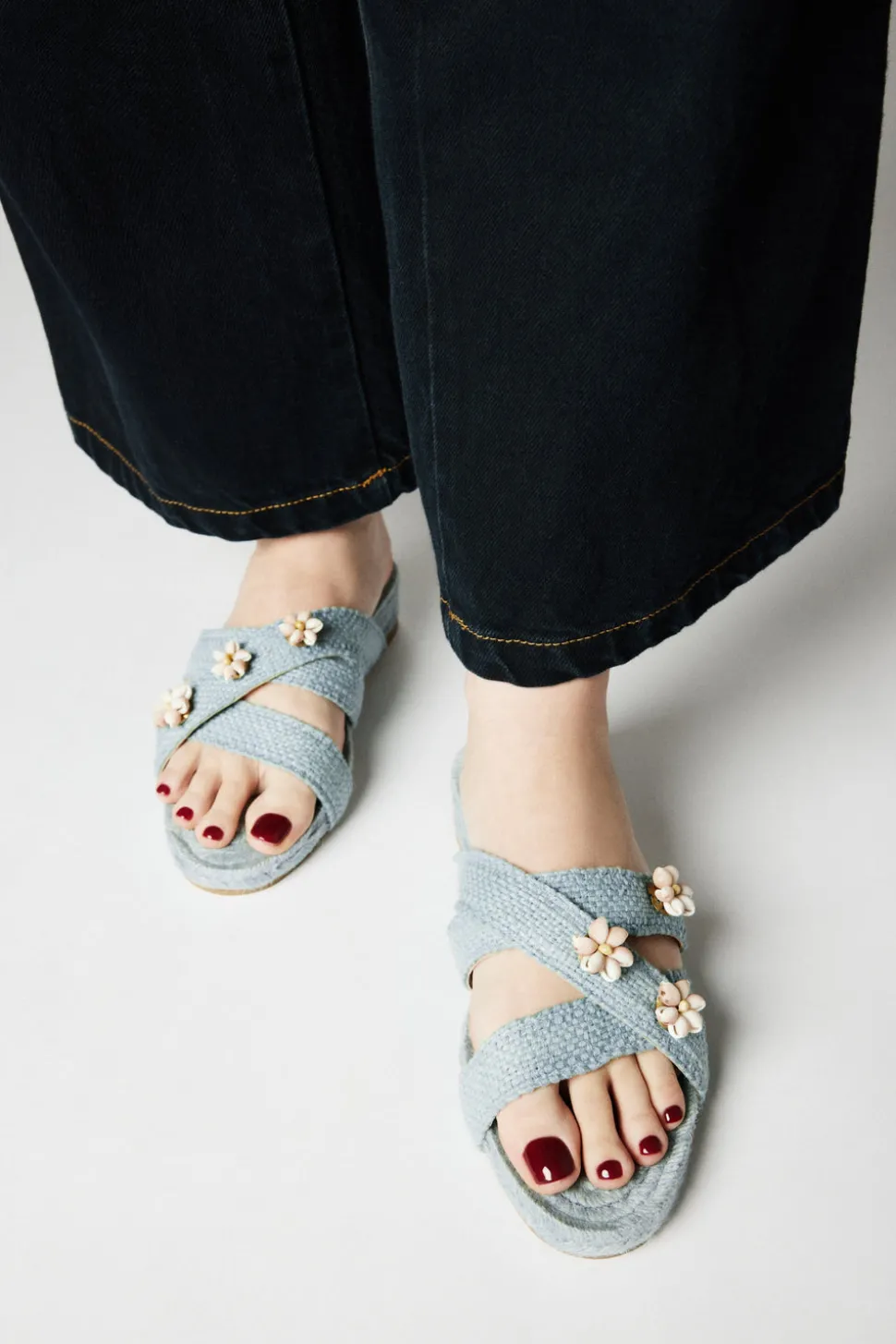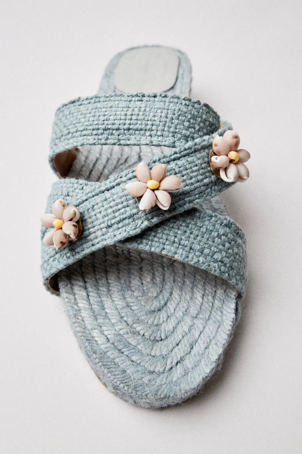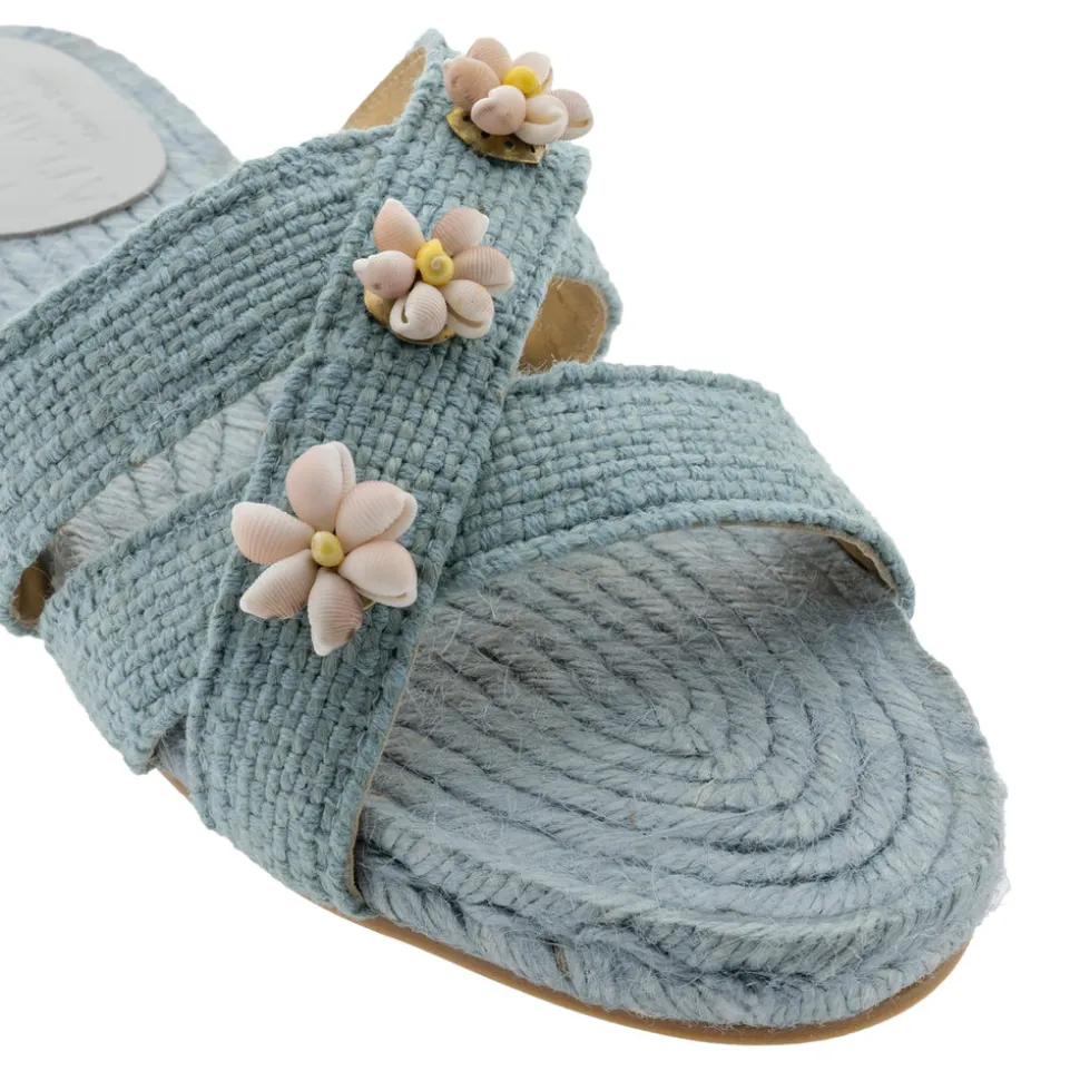 Founder Montserrat Álvarez marries the traditional craftsmanship of coastal Spain and Portugal to a modern sensibility with handwoven reeds, local leatherwork, and porcelain fetiches of the brand’s beach-to-city bags and unique accessories. The Sea Shella Espadrilles in Sky Blue pay homage to the boundless beauty of the ocean. Handcrafted by the esteemed house of Castañer—masters of Spanish footwear since 1927—this style blends time-honored technique with contemporary refinement. Each pair is embellished with natural shells, carefully hand-picked along the Atlantic coast and delicately embroidered by Galician colareiras into intricate marine patterns. A three-strap silhouette ensures comfort and stability, elegantly framing the foot. In the Sea colorway, this espadrille captures the spirit of maritime grace and slow luxury.