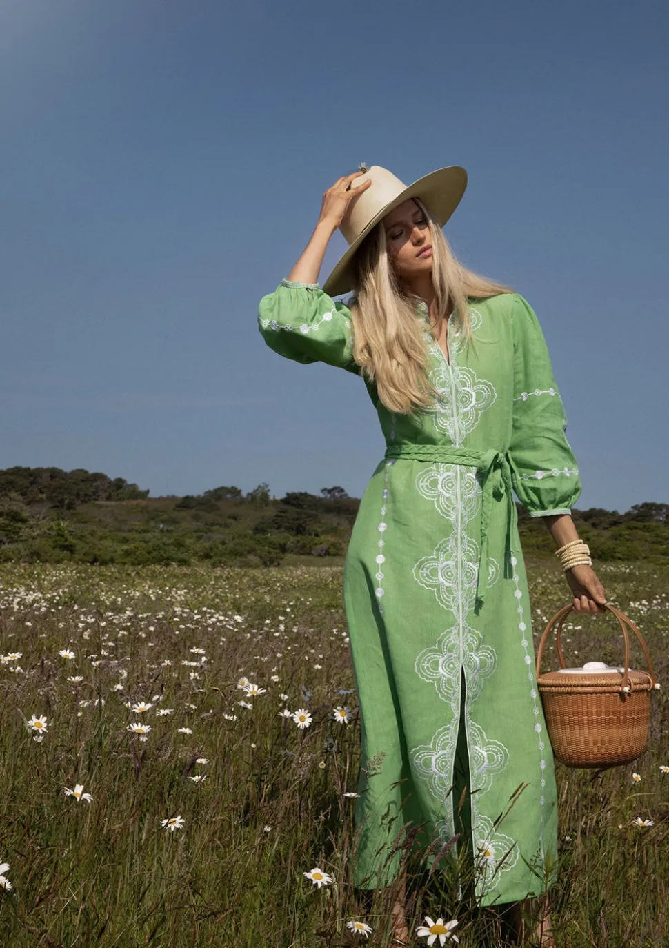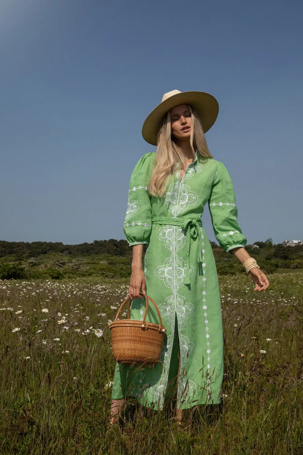 Inspired by art, architecture and the founder’s global journeys, ASHA by Ashley McCormick introduces bold, sophisticated jewelry and accessories made from only the finest materials. From everyday glamour to the red carpet, these statement pieces are classic additions to your collection. The Briar Caftan reinterprets ASHA’s beloved clover embroidery in a fresh seagrass green linen, accented with floral motifs and folk-inspired stitching. With a breezy silhouette and optional braided belt, it’s a feminine tribute to heritage craft and artisanal detail.