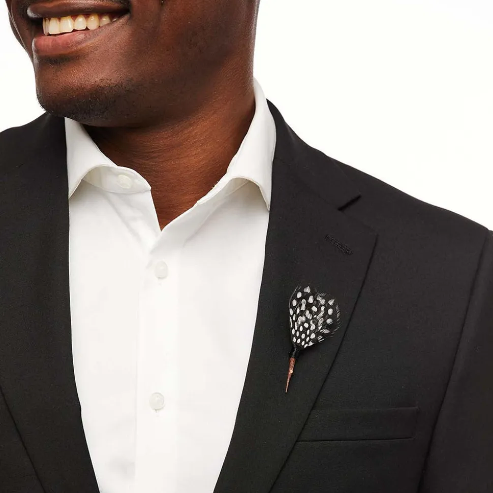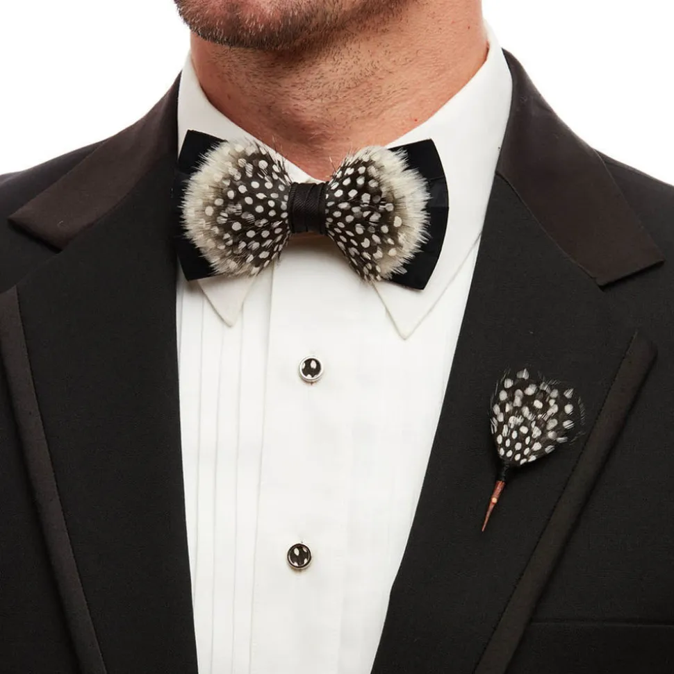 Brackish began with one feather bow tie designed by Ben Ross and gifted to his groomsman, Jeff Plotner. Since its inception, the brand has blossomed into a full line of men’s and women’s accessories designed and handcrafted in Charleston, South Carolina with each piece focused on honoring the beauty found in nature. The Seattle Pin is made with thorns from wild plum thickets are foraged, dried, and paired with hand selected feathers by our team of artisans to create a one of a kind statement. Each Plum Thicket Pin is designed to naturally complement the unique line of bow ties, or stand out on its own. They can be worn as a lapel pin, brooch, or hat pin. Made with guinea feathers. Pairs well with the Gatsby Bow Tie, as well as the River Wind, North Wind, St. Pierre, Durham, and Edisto.
