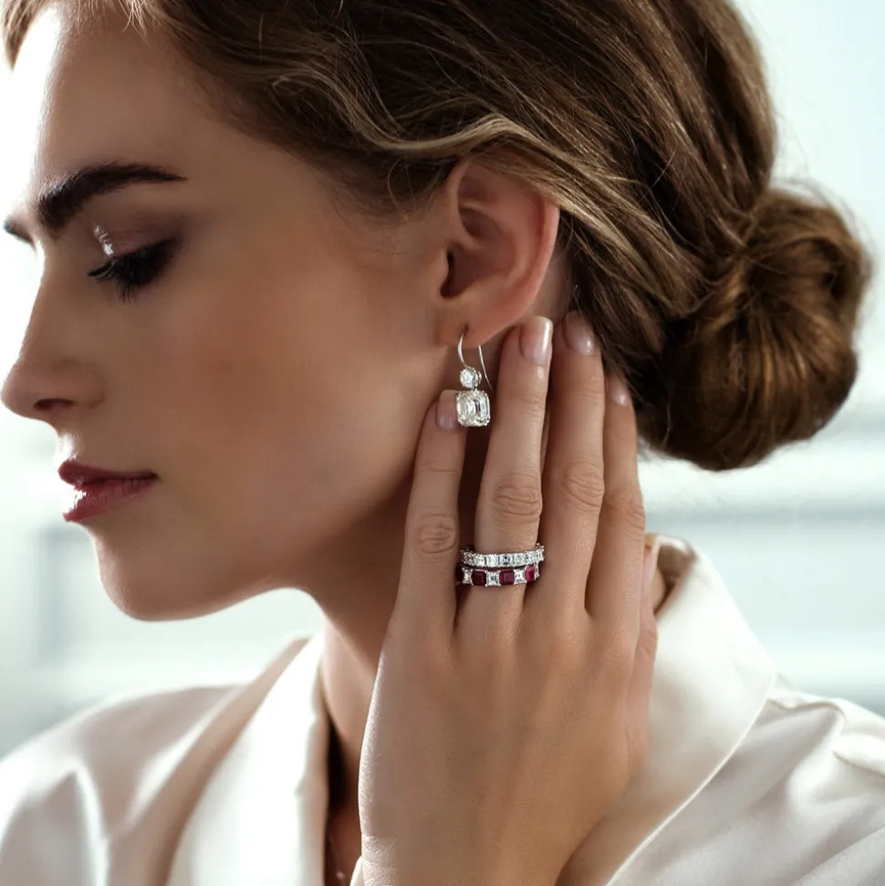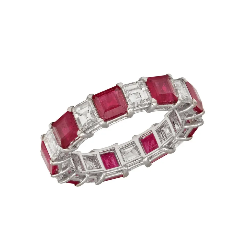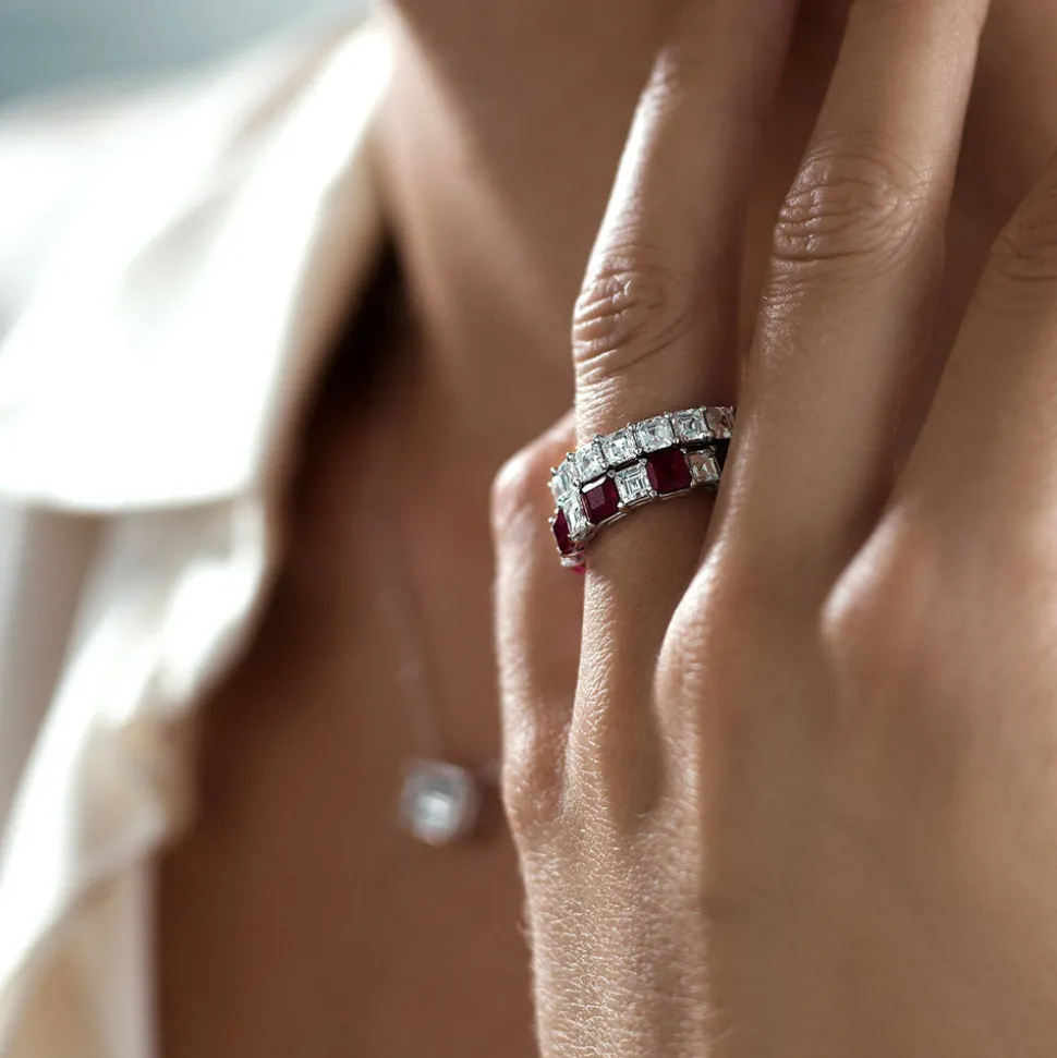 Luxury jewelry house, RUCHI New York, specializes in creating unique and versatile pieces that are exquisitely handmade and boast an heirloom quality. Crafted with precision in a variety of metals, each piece by this brand is designed to be cherished as a symbol of enduring love, whether it’s a stunning diamond ring or a timeless necklace. The Serenata Ruby Band features a striking rhythm of carré-cut rubies and diamonds—an eternity design that blends vibrant color with geometric elegance.
