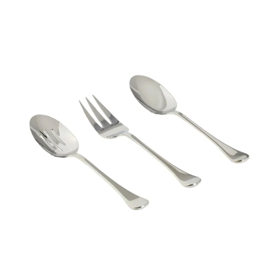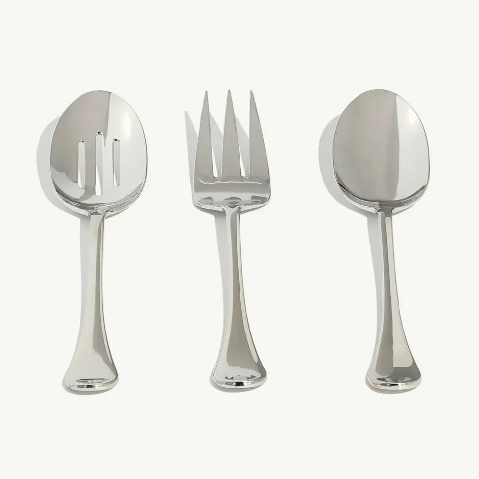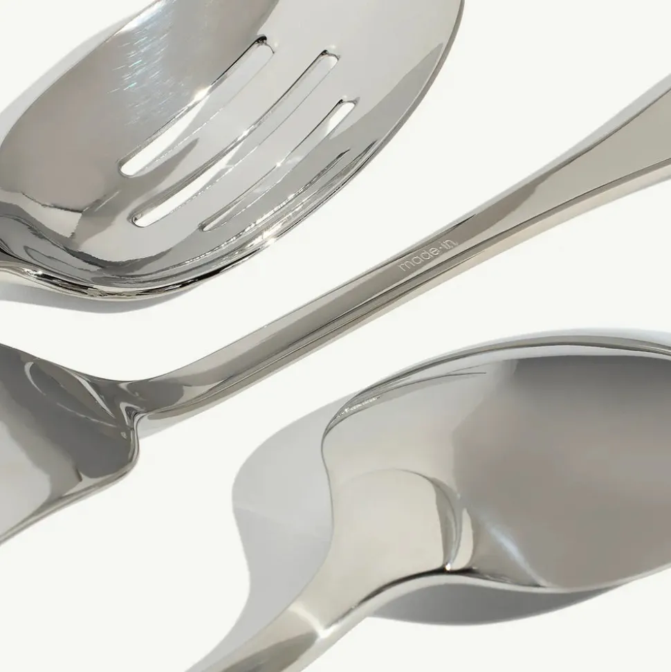 Each piece is modeled after the utensils professional chefs use to plate dishes in fine dining rooms. The three-tined Serving Fork effortlessly and tidily transfers main courses with ease, while the Serving Spoon deposits generous dollops of mashed potatoes, stuffing, puddings, custards, fruit salads, and more. For vegetables, braises, and other sauce-based dishes, the Slotted Spoon drains liquid efficiently so dinner ends up on your plate—not on the tablecloth.
