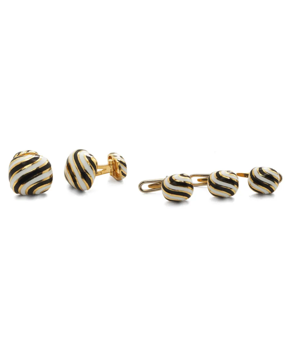 Founded in New York in 1948, David Webb has consistently redefined luxury jewelry with its bold and unique designs, crafted exclusively by master jewelers in its Upper East Side workshop. Hand-hammered gold work, colorful enamel, and signature animal pieces distinguish David Webb jewels, sought by leading tastemakers and style icons. Playful yet sophisticated, the Set of Zebra Stripe Cuff Links and 3 Studs feature striped black and white enamel atop 18-karat gold.