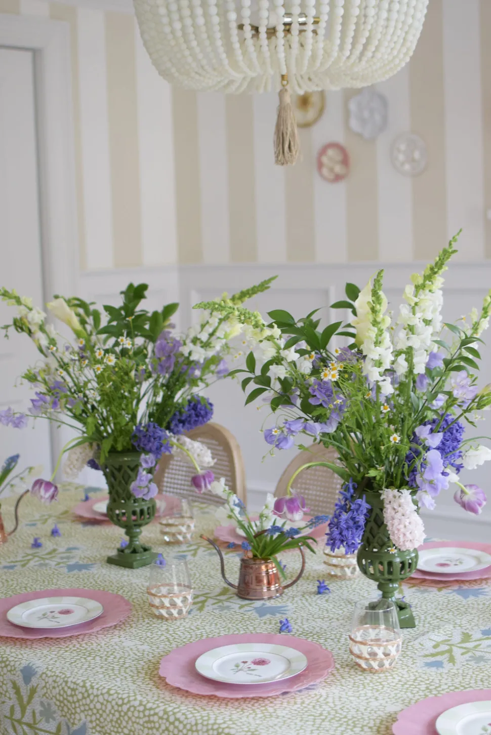 “Pretty & practical,” Maggie Bentley Designs brings an eclectic charm to everyday dressing, inspired by the color, history, and coastal beauty of Charleston. With a focus on cheerful, hand-drawn prints and timeless silhouettes, each piece blends Southern sensibility with effortless style. Designed to entertain, these thoughtful staples celebrate joy, pattern, and personality in equal abundance. The Shagreen Tulip Tablecloth features a custom-designed shagreen tulip pattern in bright sage and cornflower blue, created in collaboration with artist Danika Herrick. A vibrant yet refined addition to everyday or occasion tablescapes.