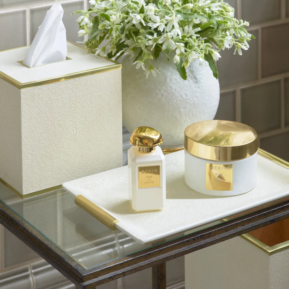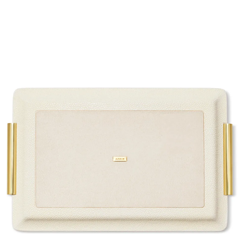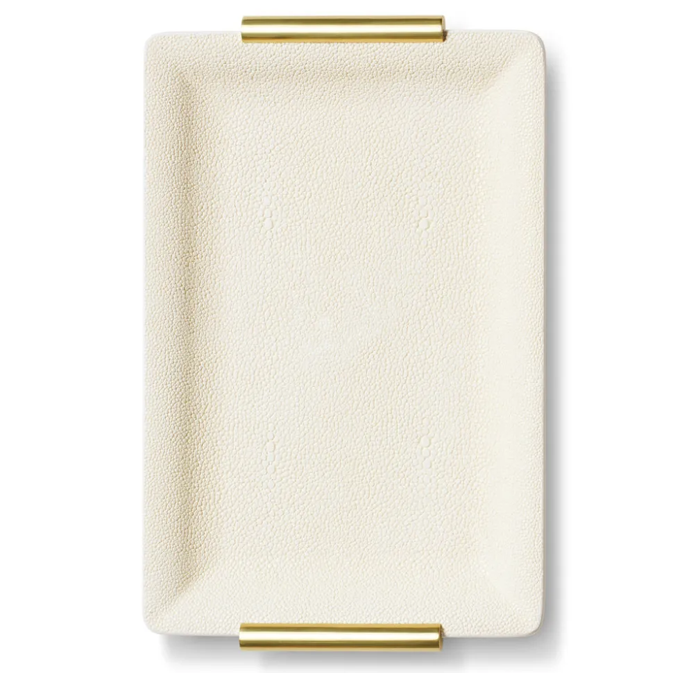 This Shagreen Vanity Tray is lined with suede and finished with gleaming brass handles in a stylish cylindrical shape. A perfect place to organize and display personal belongings on a dressing table or desk, this is eye-catching decor served.