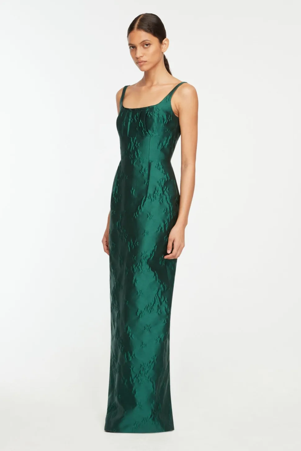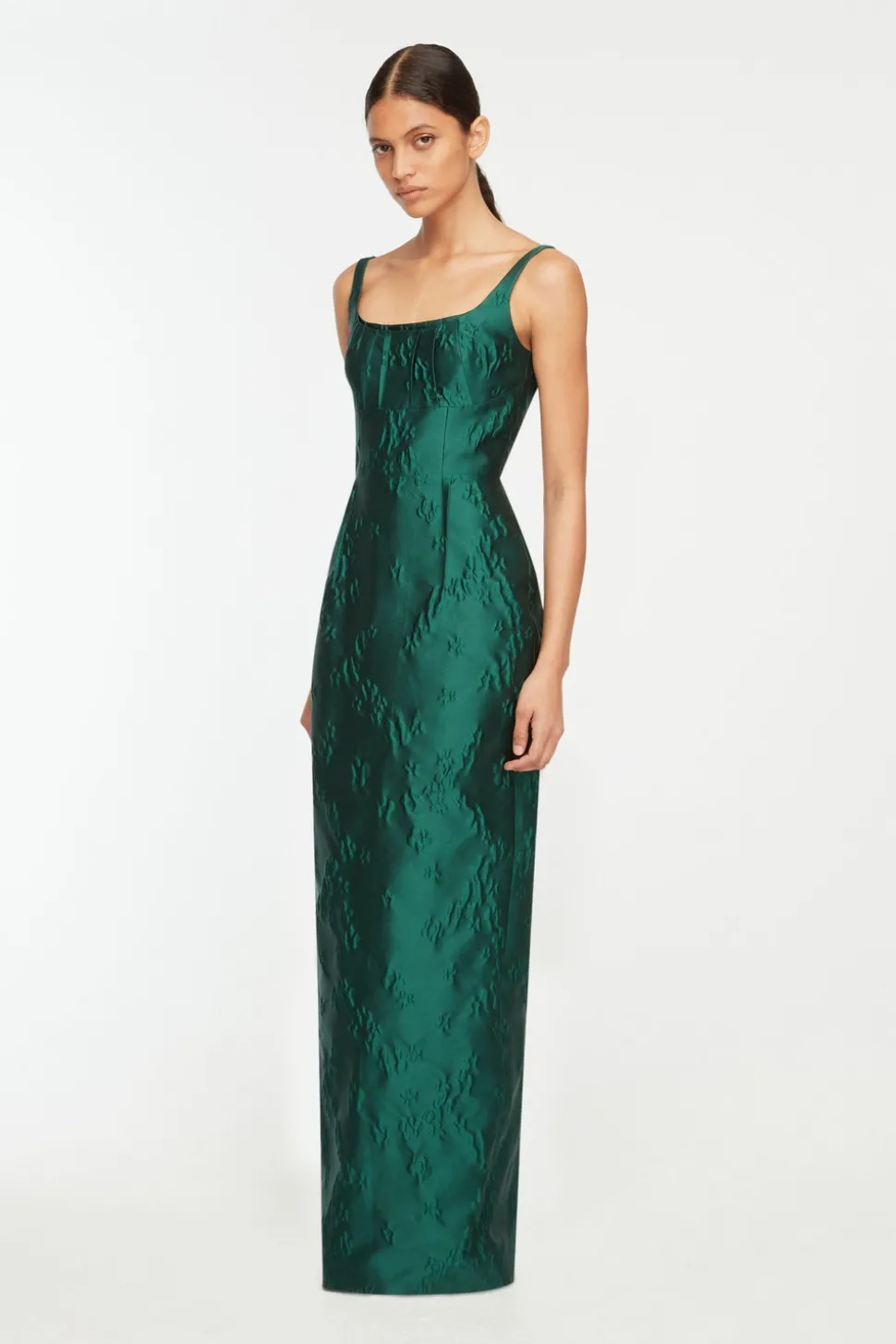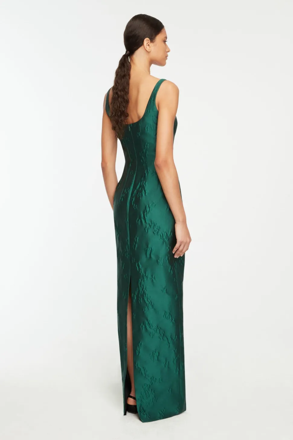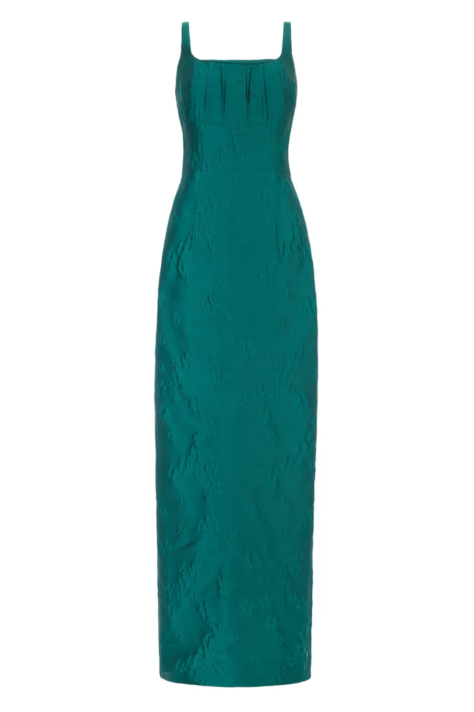 Emilia Wickstead is the epitome of modern femininity. Established in the U.K. in 2008, the ready-to-wear designer is known for impeccable tailoring, bold color, and timeless quality. The Sharon Dress in Emerald Green Ditsy Floral Jacquard is defined by architectural influences that shape its sculpted silhouette. Cut from floral-embossed jacquard in a rich emerald tone, this floor-length gown features a flattering neckline and inverted darts, offering a sense of refined opulence.
