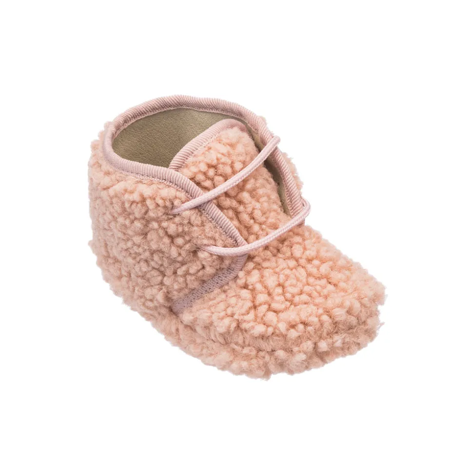 Plush faux-shearling finish in pale pink. Lace-up design ensures a secure fit. Soft interior for added warmth and comfort. Lightweight and flexible sole for ease of movement.