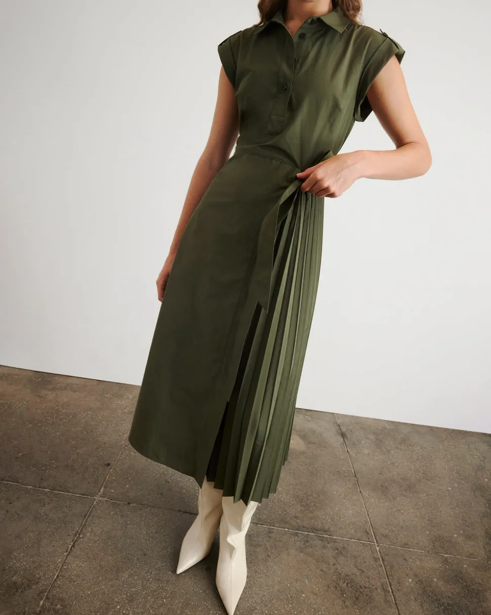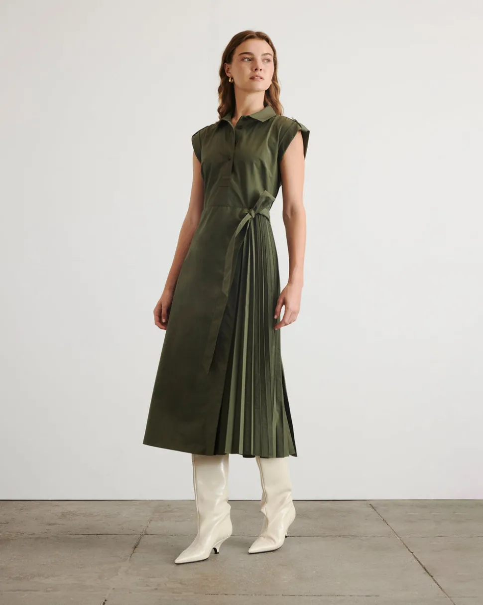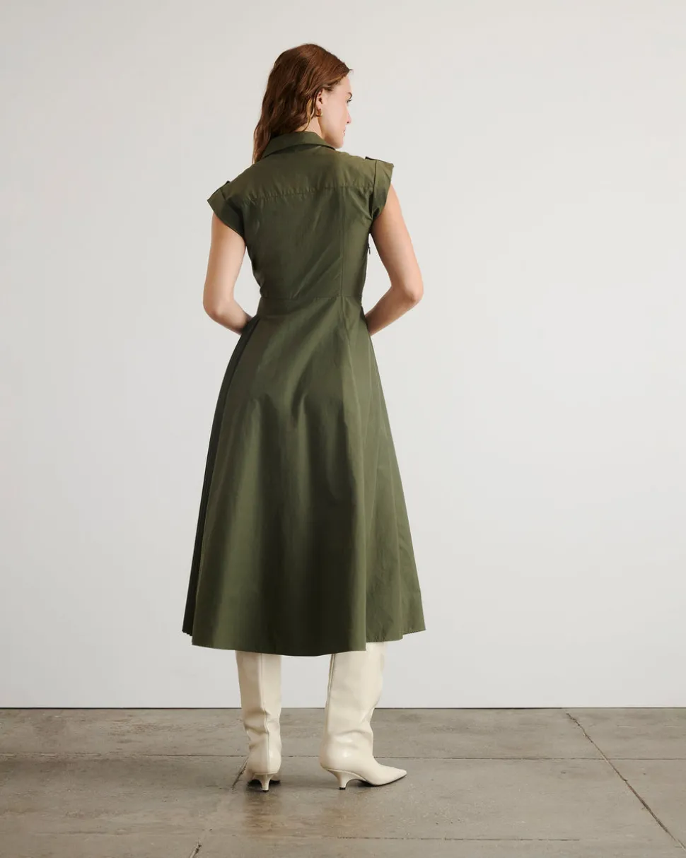 Creating clothing that inspires confidence, celebration, and community, Tanya Taylor is a New York-based womenswear brand whose mission is to provide practicality and style to a range of ready-to-wear in inclusive sizes. Each collection is thoughtfully designed through the artful use of color, texture, and original hand-painted prints. The Shivonley Dress in Army offers a fresh take on the signature cotton poplin silhouette, evolving the best-selling Midi Shivon into a crisp new staple for fall. With a collared button-up v-neckline, pleated underlay side skirt, and a self-tie belt to cinch the waist, this style brings effortless structure and versatility to everyday dressing.