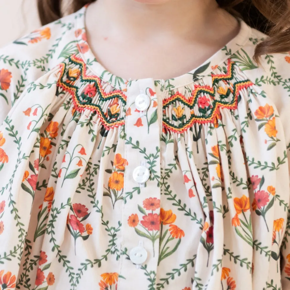 Crafted from cotton. Hand-smocked chest. Ruffle sleeve detail. Vintage-inspired floral vine print. Made in Colombia.