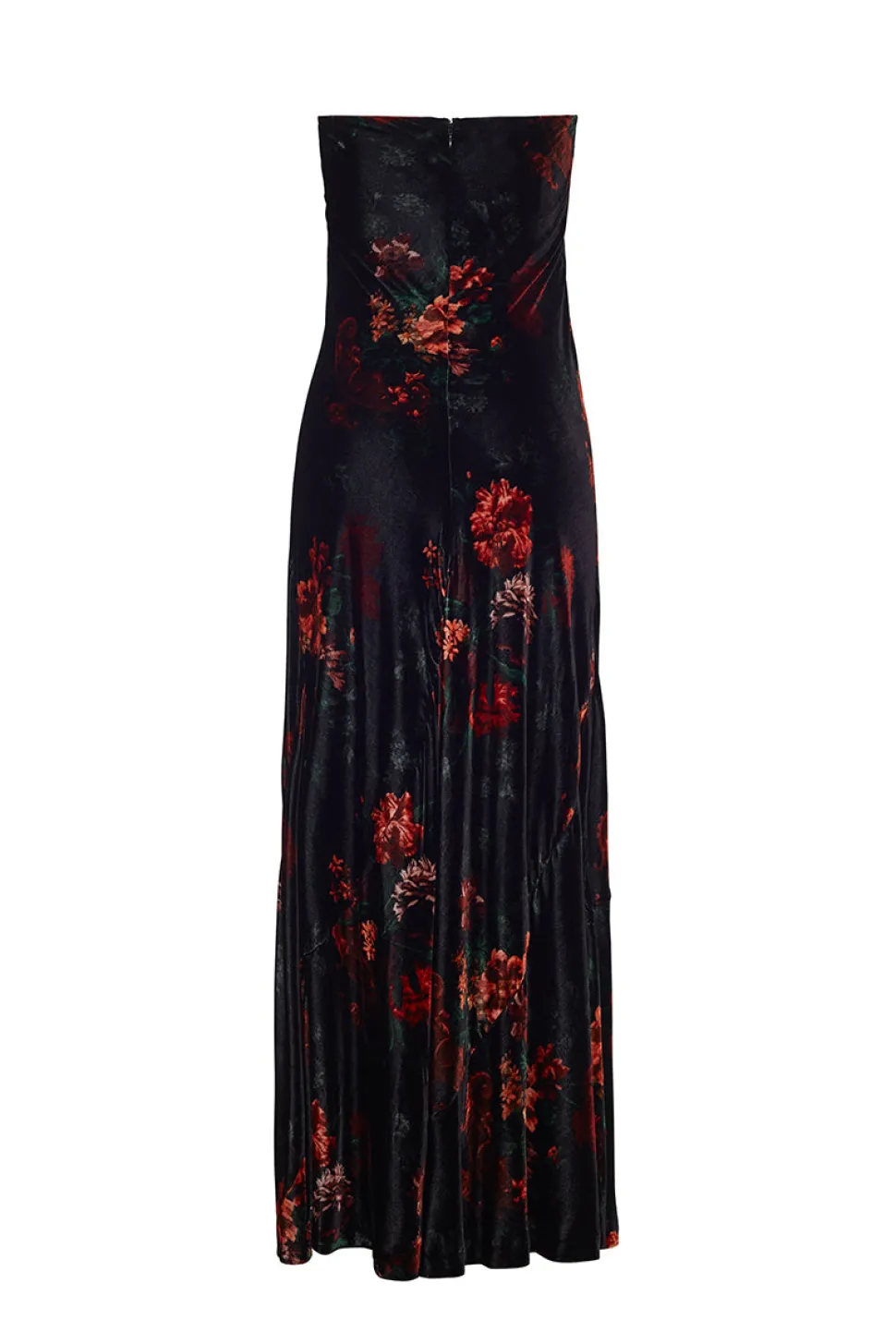Strapless paneled velvet maxi dress in Eternal Flora Black. Internal power mesh corset construction. Center back seam with invisible zipper and hook-and-eye closure. Fully lined. Allover print.
