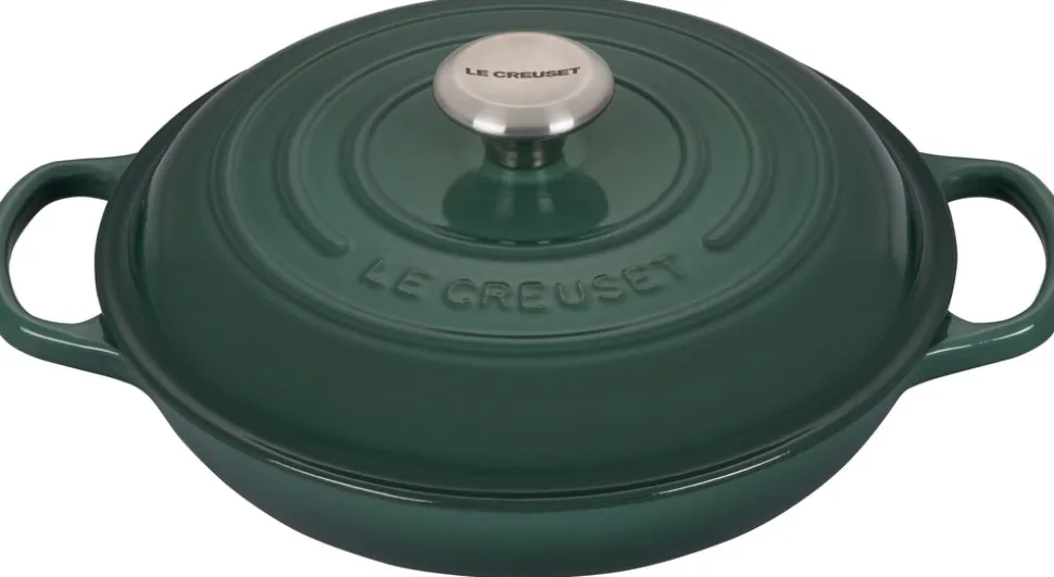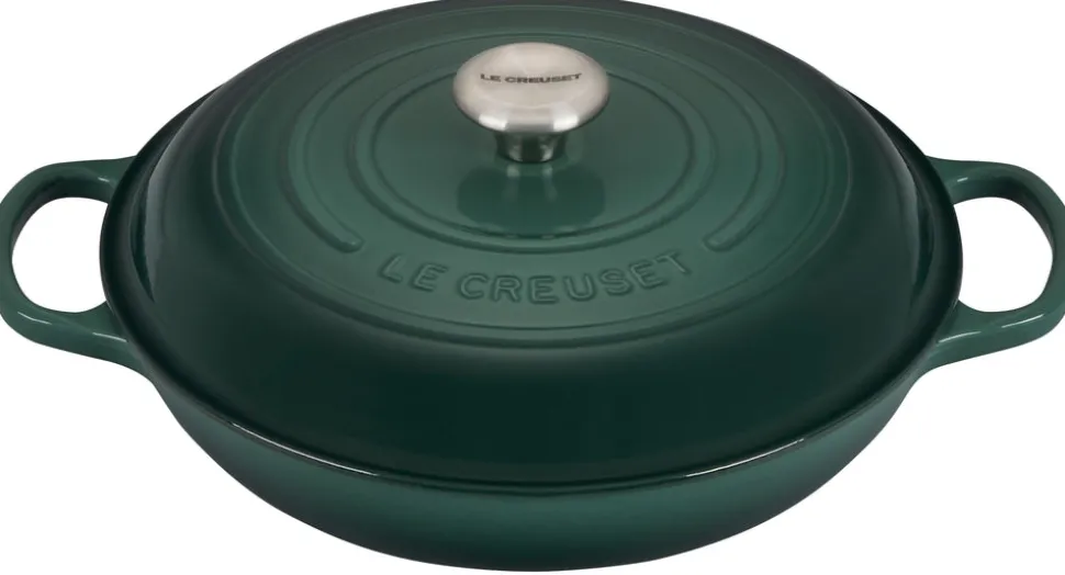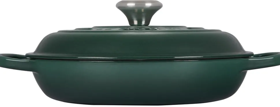 The Le Creuset enameled cast iron Braiser is uniquely designed to provide steady, even heat to transform tough cuts of meat and hearty vegetables into tender, flavorful dishes. The wide base allows ingredients to be placed in a single layer for searing without crowding; once liquid is added, the domed lid circulates steam to lock in moisture and flavor. The versatile shape of the braiser also makes it perfect for shallow frying, steaming, stews, casseroles and serving at the table.
