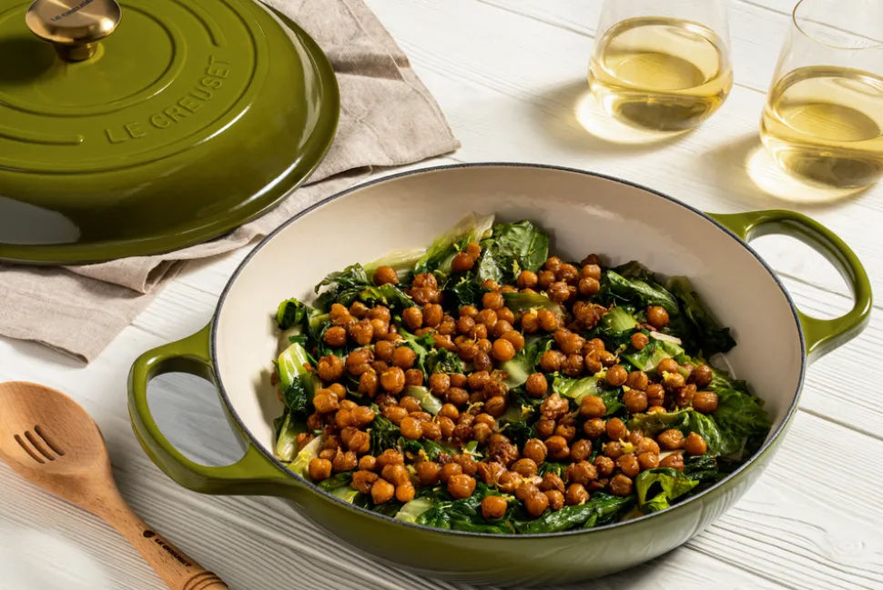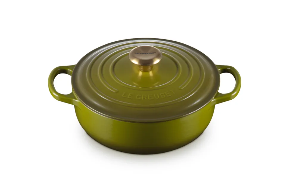 Recognized for its strength and durability, as well as its beauty and quality, Le Creuset produced the first enameled cast iron cookware nearly a century ago. A tradition of maintaining the finest culinary craftsmanship, combined with the latest innovations, means Le Creuset is made for home cooks and professional chefs alike. The Signature Braiser in Olive is uniquely designed to provide steady, even heat to transform tough cuts of meat and hearty vegetables into tender, flavorful dishes. The wide base allows ingredients to be placed in a single layer for searing without crowding; once liquid is added, the domed lid circulates steam to lock in moisture and flavor. The versatile shape of the braiser also makes it perfect for shallow frying, steaming, stews, casseroles, and serving at the table.