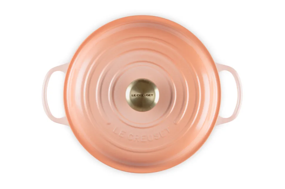 Recognized for its strength and durability, as well as its beauty and quality, Le Creuset produced the first enameled cast iron cookware nearly a century ago. A tradition of maintaining the finest culinary craftsmanship, combined with the latest innovations, means Le Creuset is made for home cooks and professional chefs alike. The Signature Braiser in Peche is uniquely designed to provide steady, even heat to transform tough cuts of meat and hearty vegetables into tender, flavorful dishes. The wide base allows ingredients to be placed in a single layer for searing without crowding; once liquid is added, the domed lid circulates steam to lock in moisture and flavor. The versatile shape of the braiser also makes it perfect for shallow frying, steaming, stews, casseroles, and serving at the table.