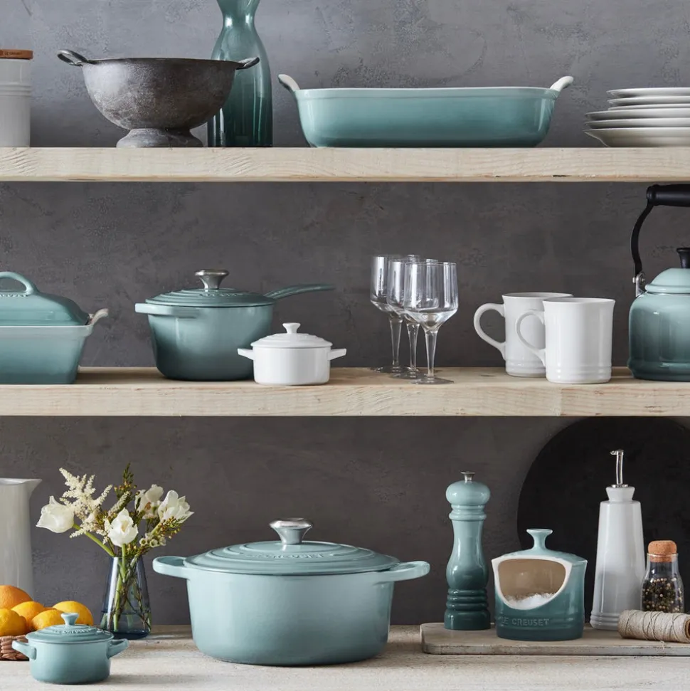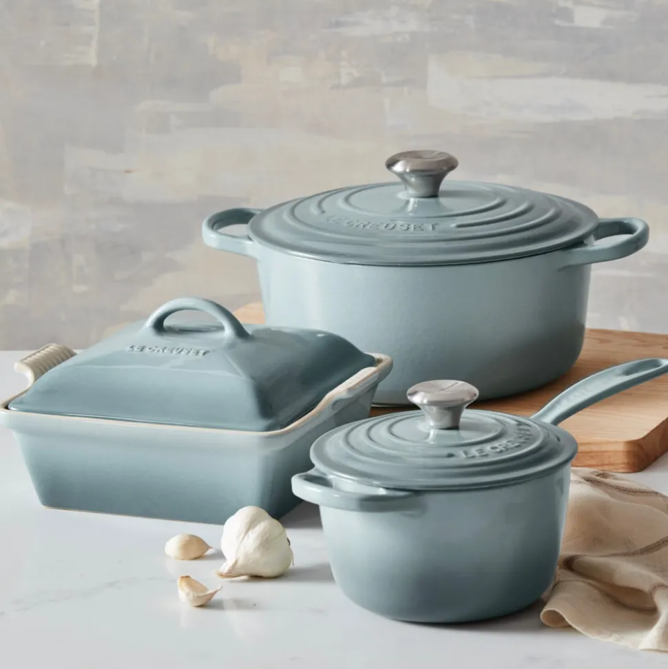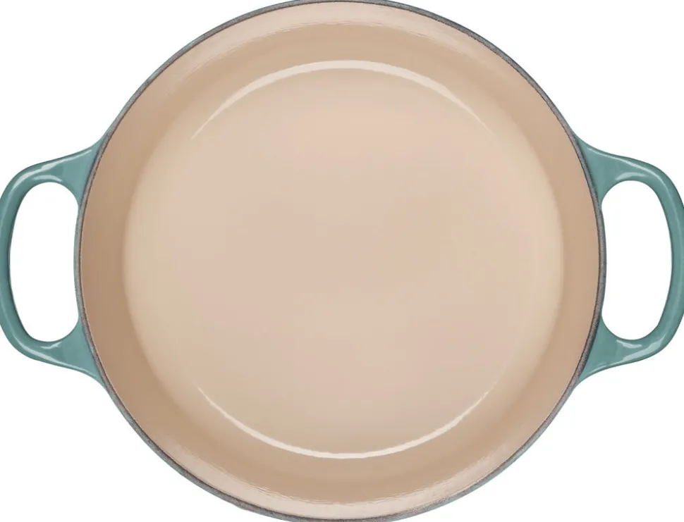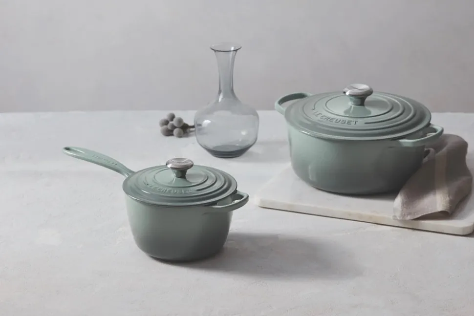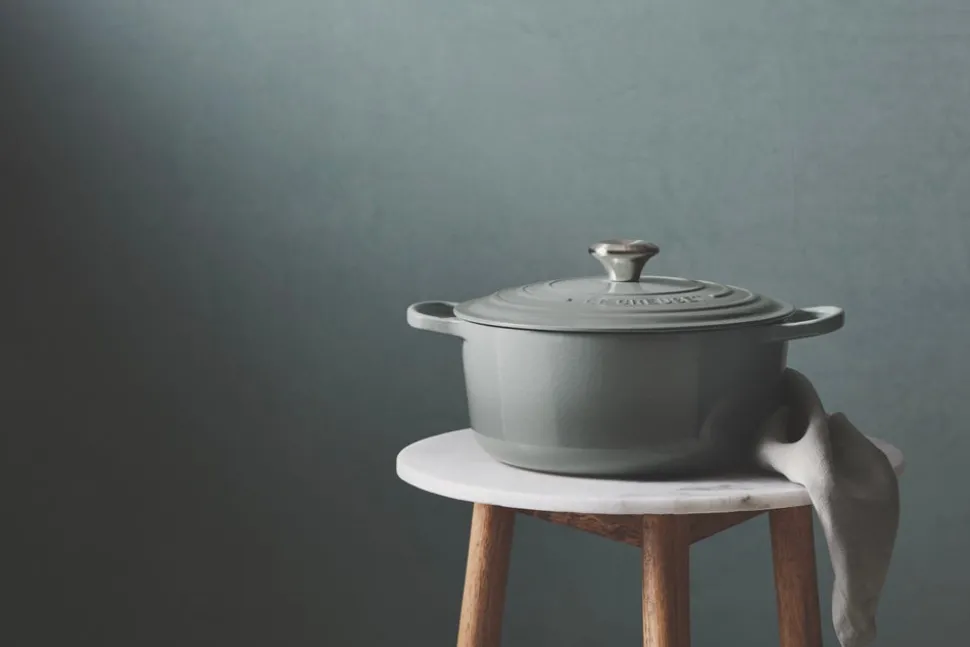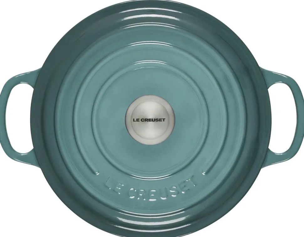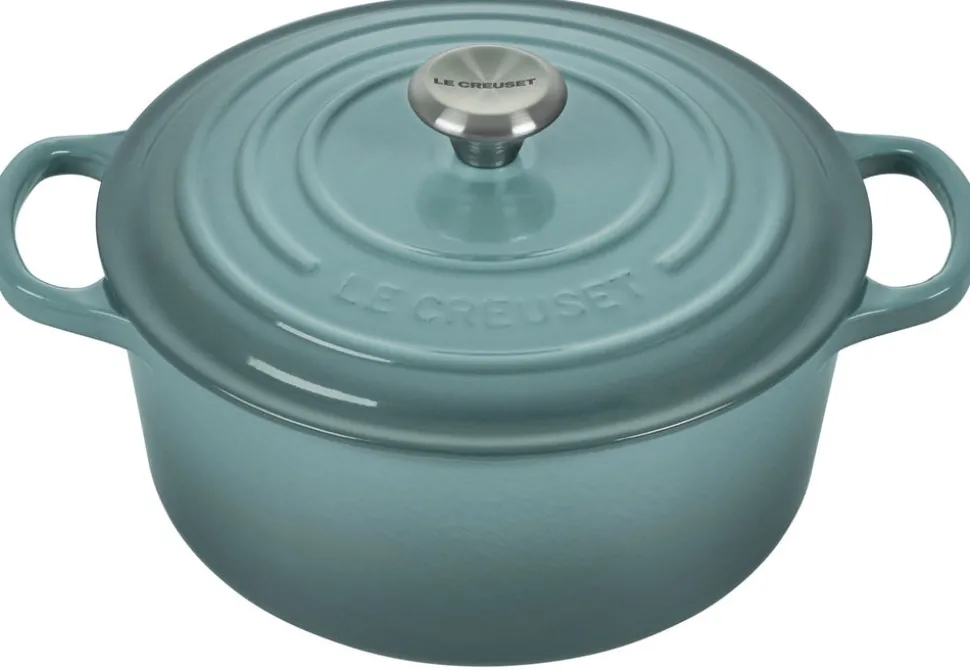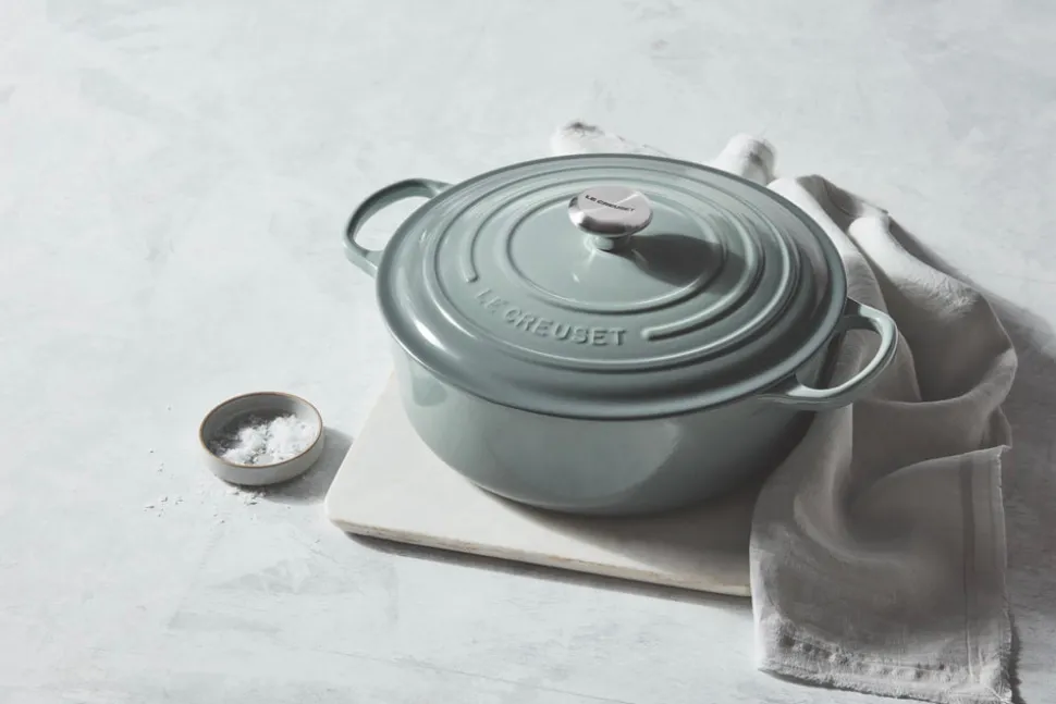 Recognized for its strength and durability, as well as its beauty and quality, Le Creuset produced the first enameled cast iron cookware nearly a century ago. A tradition of maintaining the finest culinary craftsmanship, combined with the latest innovations, means Le Creuset is made for home cooks and professional chefs alike. The iconic Signature Round Dutch Oven in Sea Salt is indispensable in the kitchens of home cooks and professional chefs alike. Expertly crafted from enameled cast iron, the everyday versatility of the Dutch oven makes it ideal for everything from slow cooking and braising to roasting, baking, frying, and more.
