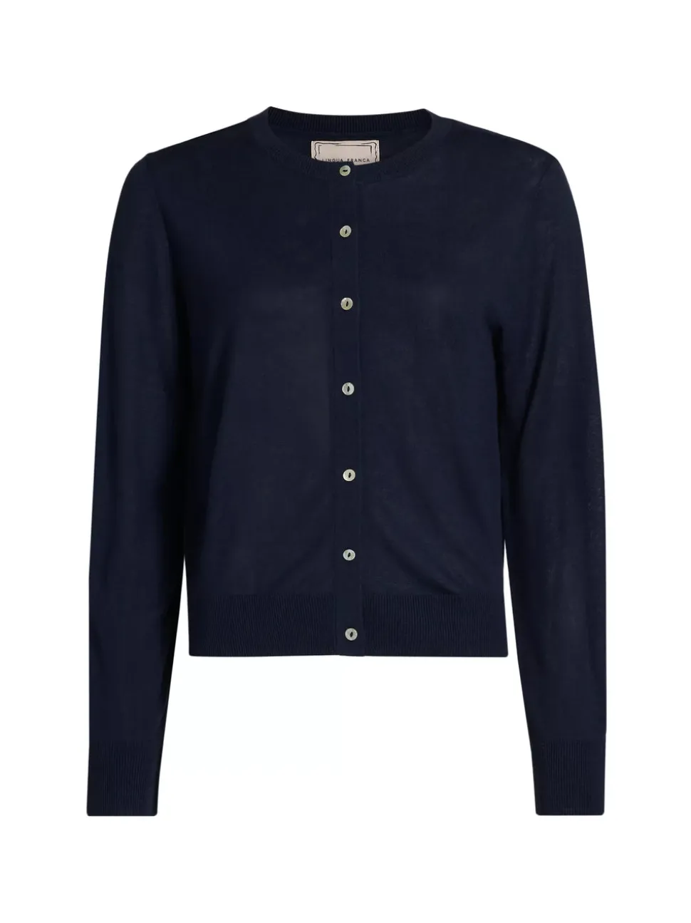 Lingua Franca is a line of sustainably-sourced, fair trade luxury ready-to-wear and cashmere pieces, all hand-stitched by women in New York City. Every word on Lingua Franca’s staple pullover sweaters is chalked in script by designer Rachelle Hruska MacPherson before it is ever stitched. Crafted from a luxurious silk blend yarn and finished with mother-of-pearl buttons, the Silk Blend Cardigan in Navy is the ideal lightweight layer for summer.