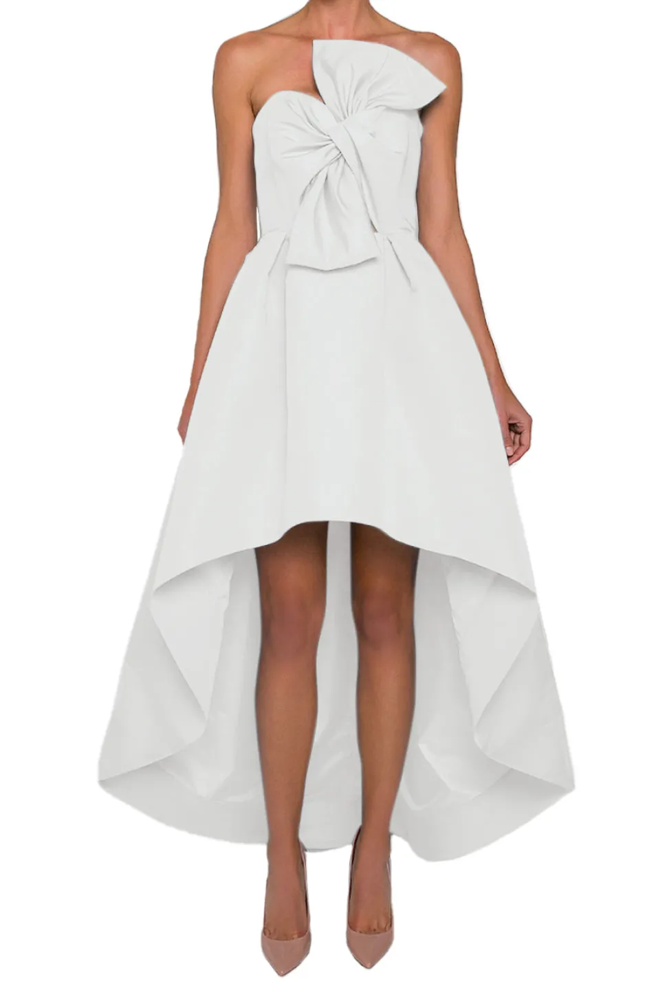 100% silk shell and 100% polyester lining. Boned bodice. Side-seam pockets. Pleated full skirt with a high-low hem. Self-tied twisted bow on the bodice. Concealed back zipper with hook-and-eye closure. Made in the USA.
