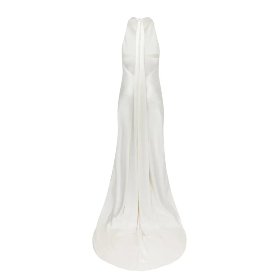 Handmade at its London atelier, The OWN Studio’s signature style combines pared-back, contemporary silhouettes with unexpected vintage details resulting in considered, minimal styles for the modern woman. The label brings a fresh and contemporary approach to wedding and evening wear. The exquisite level of craftsmanship and attention to detail of the OWN atelier is evident when looking at the incredibly sleek cut of the Silk Halter Dress with Organza Back Strap | STYLE 029. Delicate folds around the neck create a flattering and soft shape while the back is fastened by a long trailing sash tie, crafted in the same lustrous silk satin. While the dress is completely backless, the waist remains cinched at the front by a clever illusion silk organza strap at the back. A long flowing train creates beautiful movement.