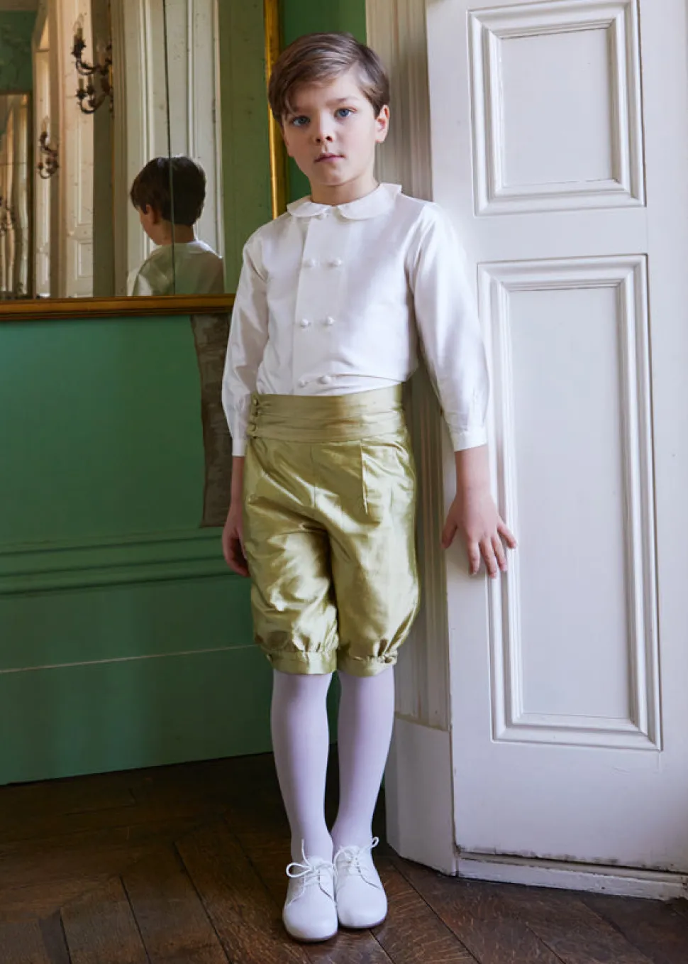 Renowned for exceptional craftsmanship and timeless design, Pepa London creates traditional childrenswear to be treasured and passed down. Each piece reflects the brand’s belief in dressing children like children, combining British style with refined details, comfort, and enduring elegance. The Silk Pageboy Knickerbockers in Green are made from fine silk dupion and feature pleated detailing, buttoned leg turn-ups, and an adjustable waistband—an elevated choice for weddings and special occasions, especially when styled with a matching cummerbund and celebration shirt.
